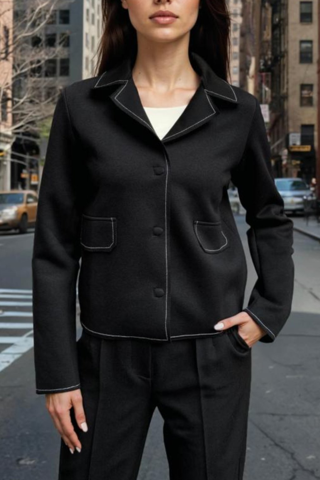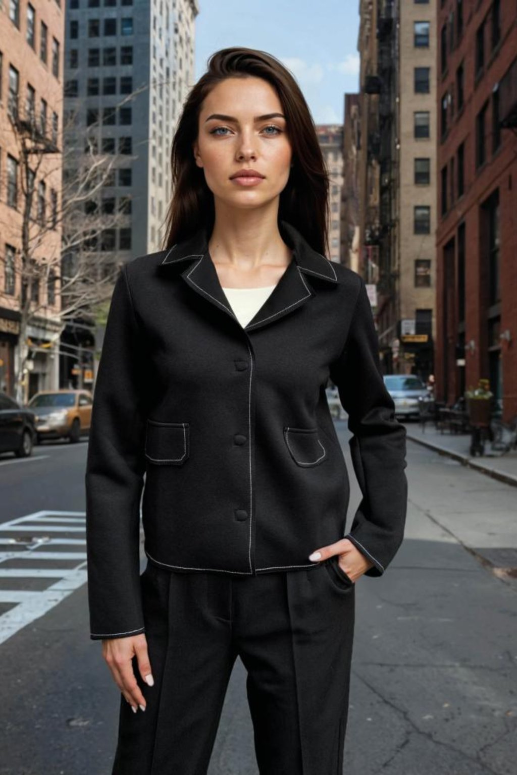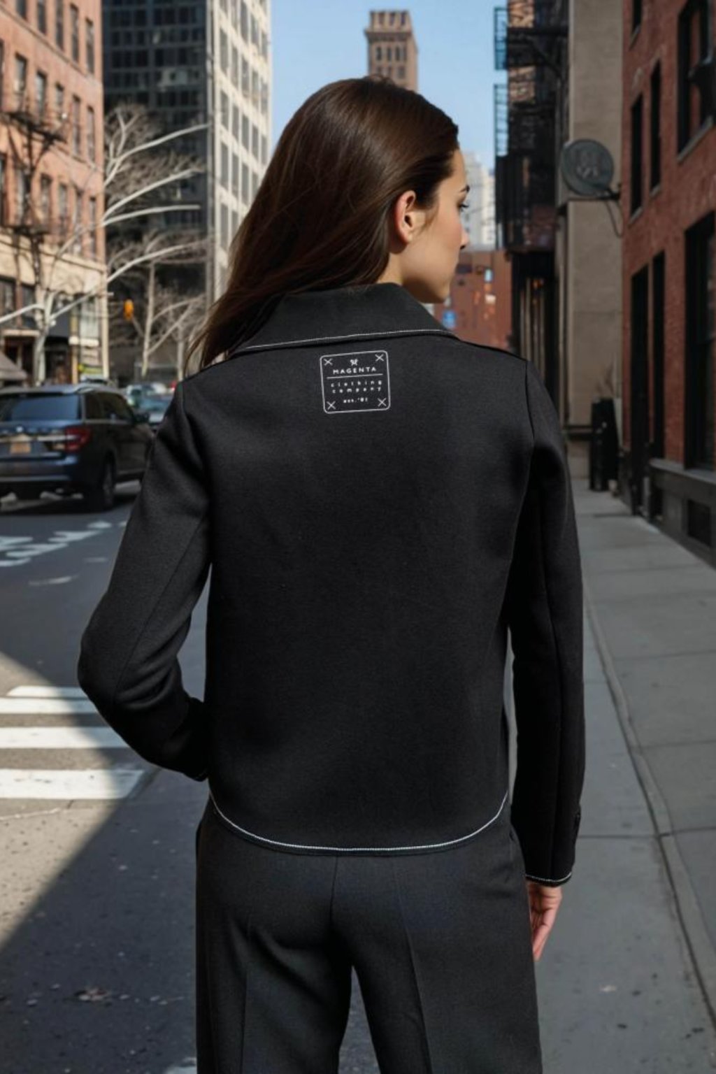 Dámská bunda Magenta v elegantním černém provedení představuje moderní kombinaci ležérního a business stylu. Díky kvalitnímu neoprénovému materiálu a propracovaným detailům působí luxusně, ale zároveň zůstává pohodlná pro každodenní nošení. Výrazné kontrastní prošití dodává bundě originální vzhled, zatímco rovný střih lichotí postavě. Stylový límec, zapínání na knoflíky a dvě přední kapsy podtrhují minimalistický, ale promyšlený design. Na zadní straně je decentní logo značky Magenta, které potvrzuje prémiovou kvalitu modelu. Perfektní volba k elegantním kalhotám i džínám, ideální pro podzimní a přechodové období.