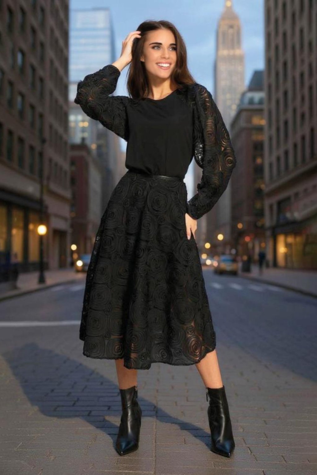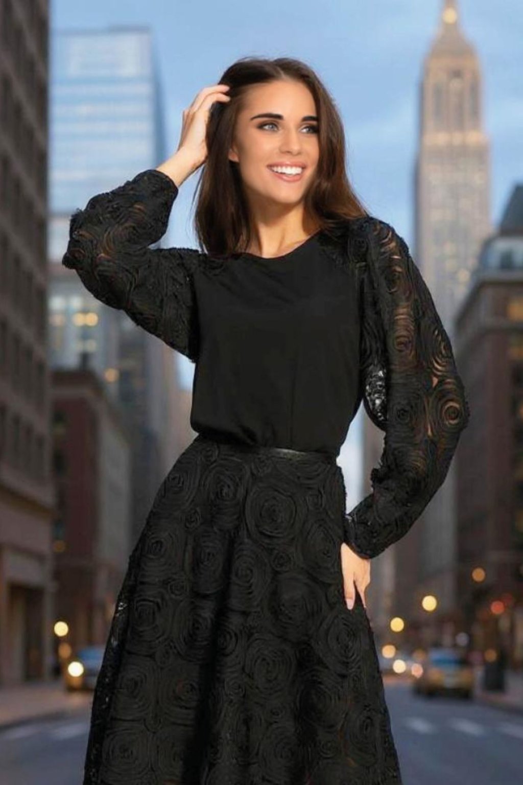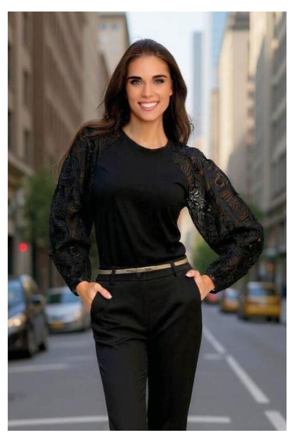 Luxusní společenská halenka značky Magenta je dokonalou volbou pro ženy, které chtějí působit elegantně, žensky a sebevědomě. Černý top je navržen tak, aby vynikl při slavnostních příležitostech, pracovních schůzkách i večerních událostech. Klíčovým prvkem jsou výrazné transparentní rukávy s 3D květinovým vzorem, které dodávají celému modelu unikátní charakter. Měkký, pohodlný materiál krásně splývá na postavě a zajistí komfort po celý den. Perfektně ladí se společenskými kalhotami i sukní do pasu, což z něj dělá univerzální kousek do elegantního šatníku.