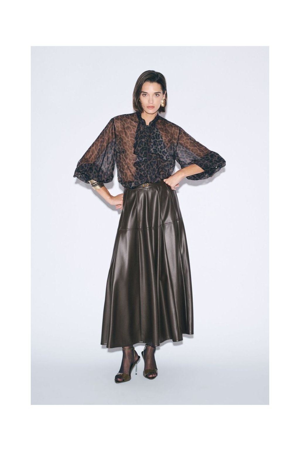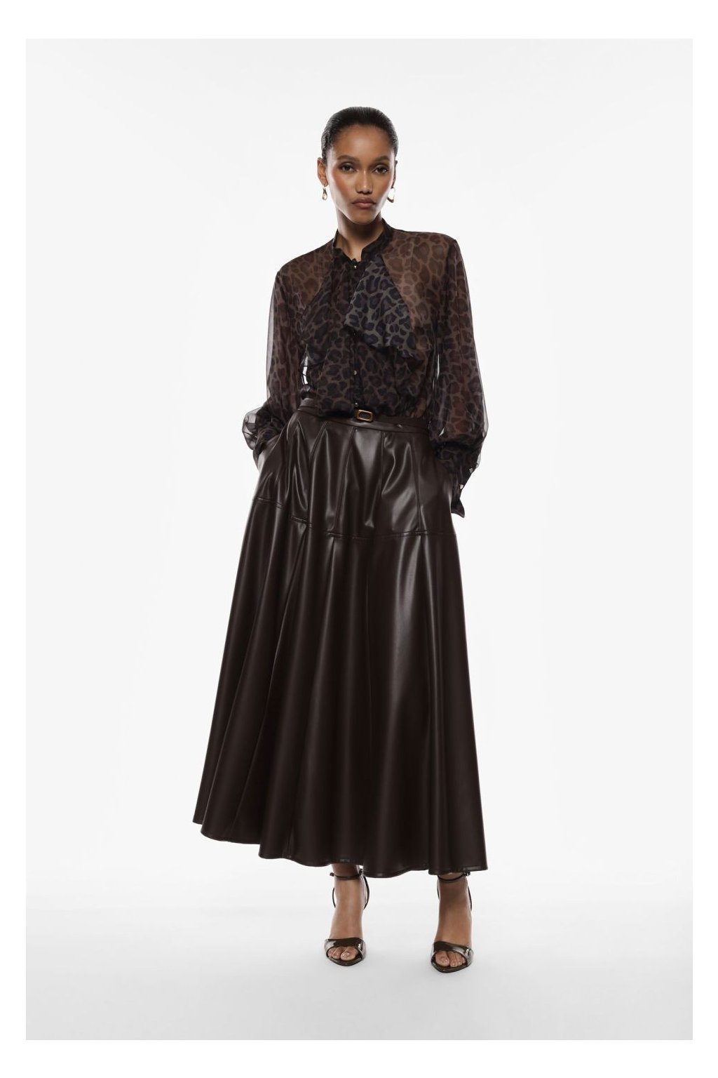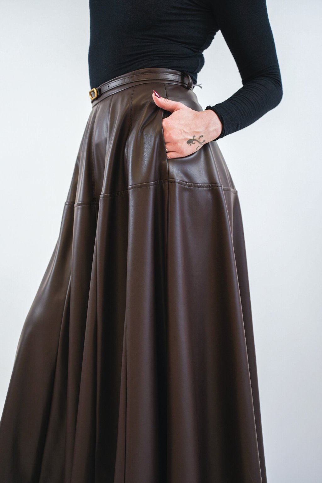 Dámská kolová midi sukně značky Imperial z prémiové koženky představuje nadčasový kousek, který dodá každému outfitu šmrnc i eleganci. Díky lehce rozšířenému střihu krásně splývá a při chůzi působí velmi žensky. Vyrobena z měkké a kvalitní koženky, která se přirozeně leskne a je příjemná na dotek. Součástí modelu je úzký pásek s kovovou přezkou, který zvýrazní pas a dodá outfitu dokonalé proporce. Ideální v kombinaci s halenkou nebo úpletovým topem pro společenské i denní nošení.