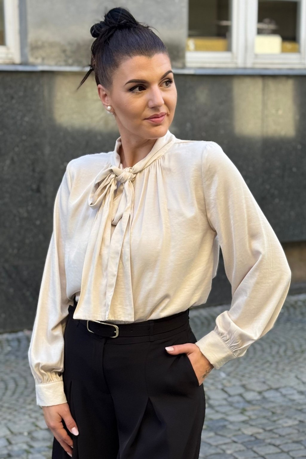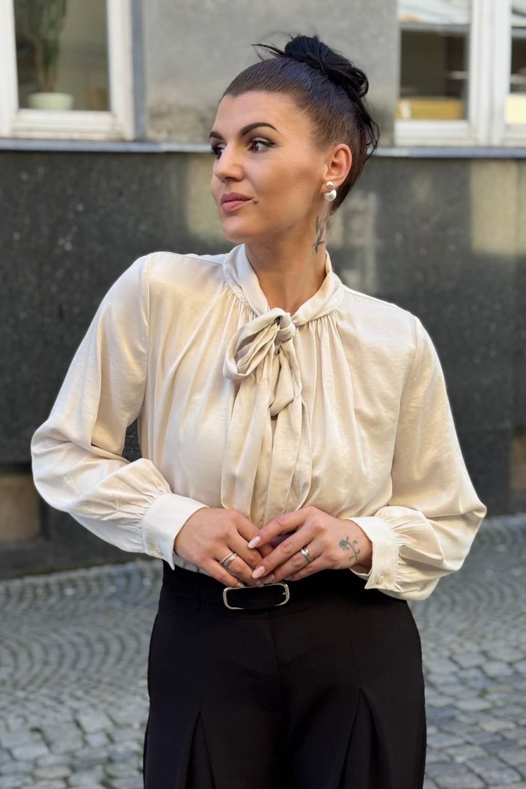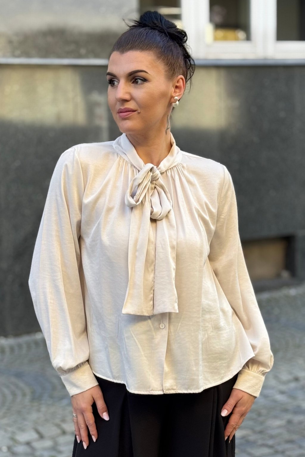 Dámská košile Imperial z jemného viskózového saténu je dokonalým kouskem pro ženy, které chtějí vypadat elegantně a zároveň se cítit pohodlně. Luxusní saténový materiál s jemným leskem působí sofistikovaně a díky svému lehkému spádu krásně sedí na postavě. Výrazným detailem je vázačka u krku, kterou lze uvázat do mašle, kravaty nebo volně nechat splývat – podle příležitosti. Dlouhé rukávy jsou zakončené manžetou na knoflíček a jemné řasení v horní části dodává blůze ženský nádech. Tato nadčasová košile se hodí do práce, na schůzku i na slavnostní událost, kde vynikne v kombinaci s elegantními kalhotami či sukní.