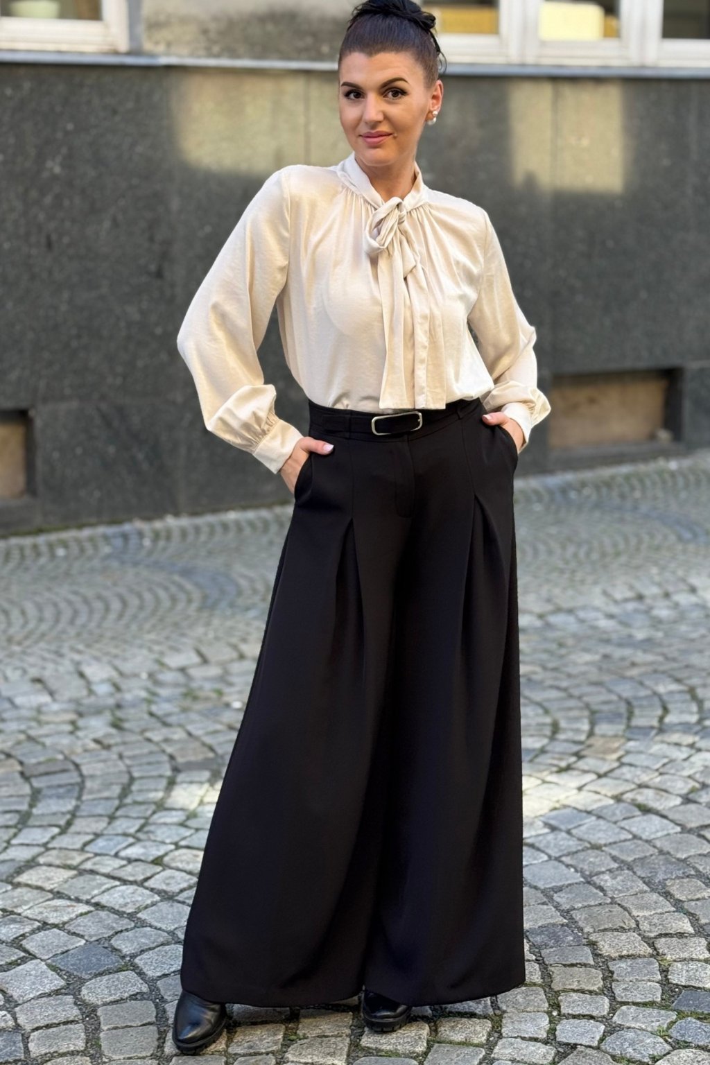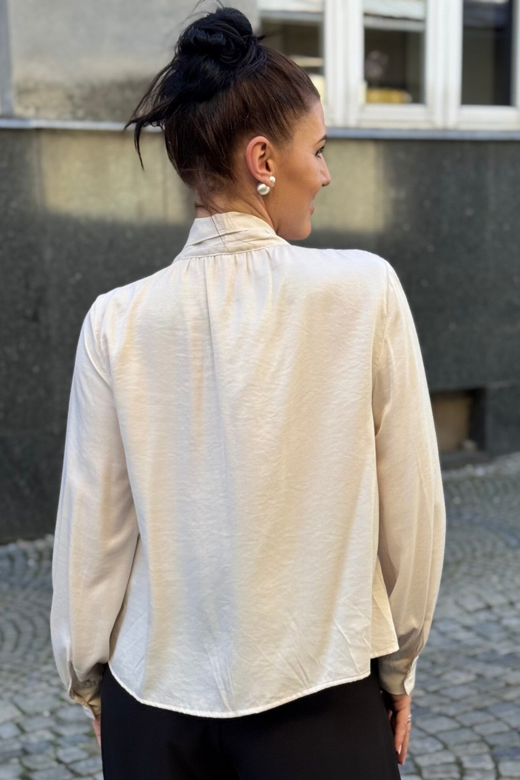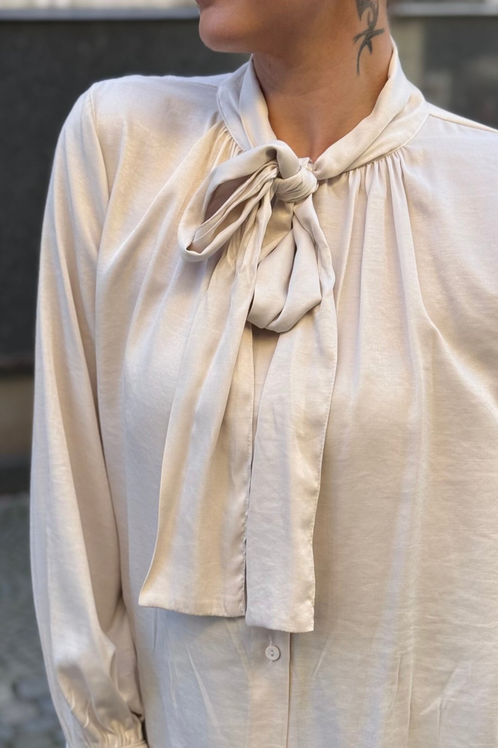Dámská košile Imperial z jemného viskózového saténu je dokonalým kouskem pro ženy, které chtějí vypadat elegantně a zároveň se cítit pohodlně. Luxusní saténový materiál s jemným leskem působí sofistikovaně a díky svému lehkému spádu krásně sedí na postavě. Výrazným detailem je vázačka u krku, kterou lze uvázat do mašle, kravaty nebo volně nechat splývat – podle příležitosti. Dlouhé rukávy jsou zakončené manžetou na knoflíček a jemné řasení v horní části dodává blůze ženský nádech. Tato nadčasová košile se hodí do práce, na schůzku i na slavnostní událost, kde vynikne v kombinaci s elegantními kalhotami či sukní.
