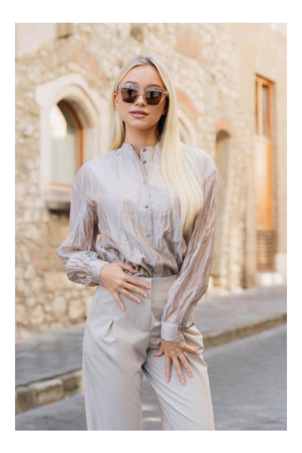 Košile má stojáčkový límeček a zapínání na jemné knoflíčky po celé délce. Dlouhé rukávy jsou zakončeny manžetami, které dodávají celkovému vzhledu upravený a sofistikovaný styl. Lehký krčený efekt materiálu působí trendy a dodává košili jedinečný charakter. Díky neutrálnímu barevnému provedení se snadno kombinuje s kalhotami i sukní a je ideální volbou jak do kanceláře, tak i na volný čas.