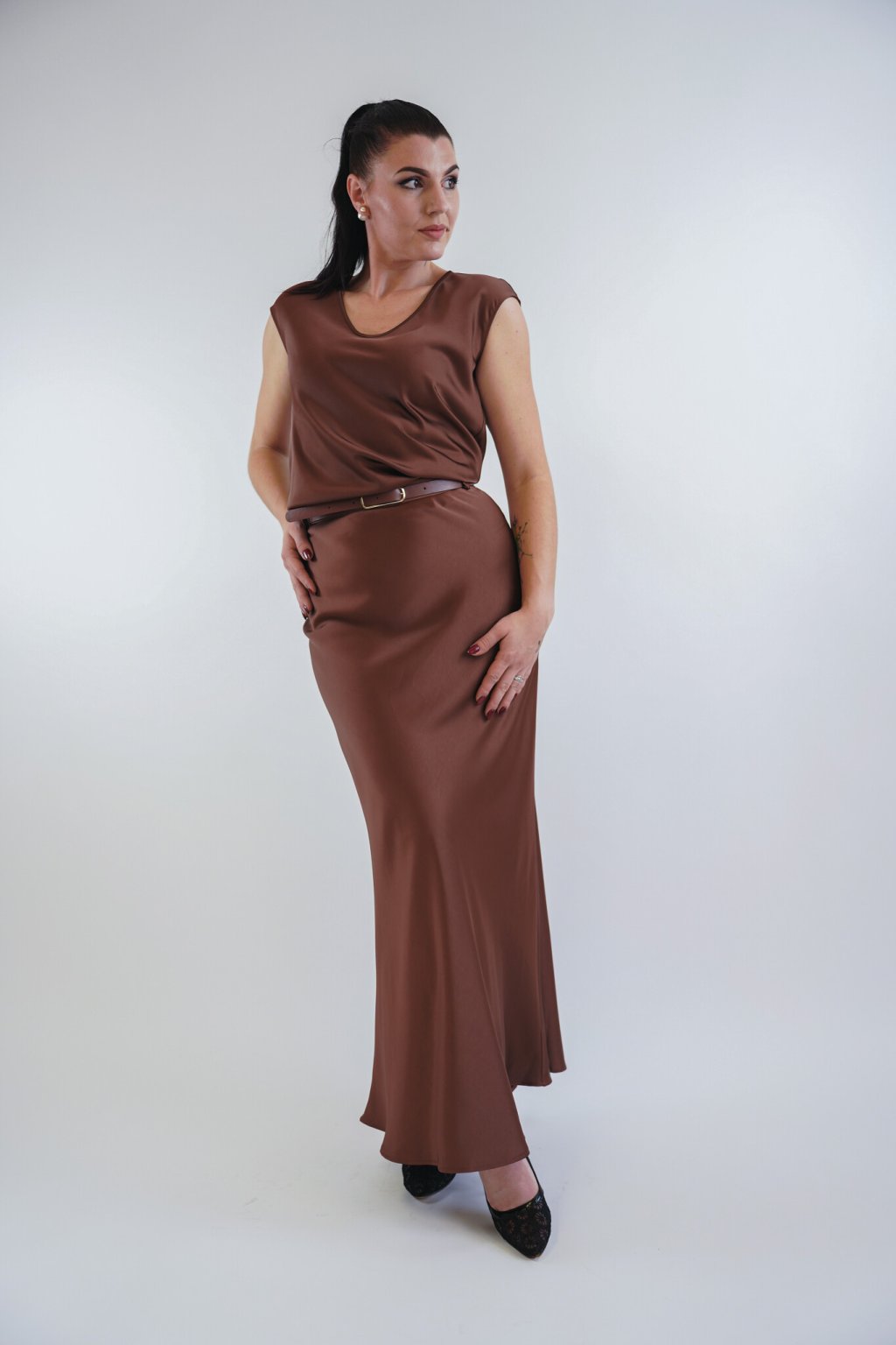 dlouhý maxi střih s luxusním saténovým efektem