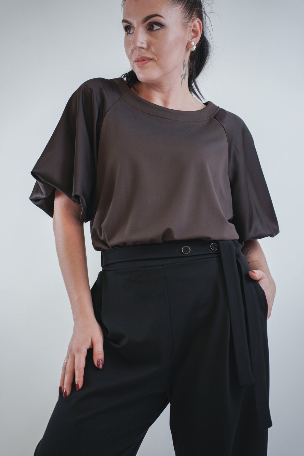 Dámská mikina značky Imperial Fashion vyniká svým sofistikovaným vzhledem a prémiovým zpracováním. Kombinace matného úpletu a saténových rukávů dodává modelu luxusní kontrast, který působí elegantně i uvolněně zároveň. Balonové rukávy vytvářejí ženskou siluetu, zatímco jednoduchý střih zajišťuje pohodlí při nošení. Stylový detail tvoří kapkovitý výstřih na zádech se zapínáním na knoflík. Ideální volba pro moderní ženy, které hledají elegantní mikinu do městských outfitů i ležérních kombinací.