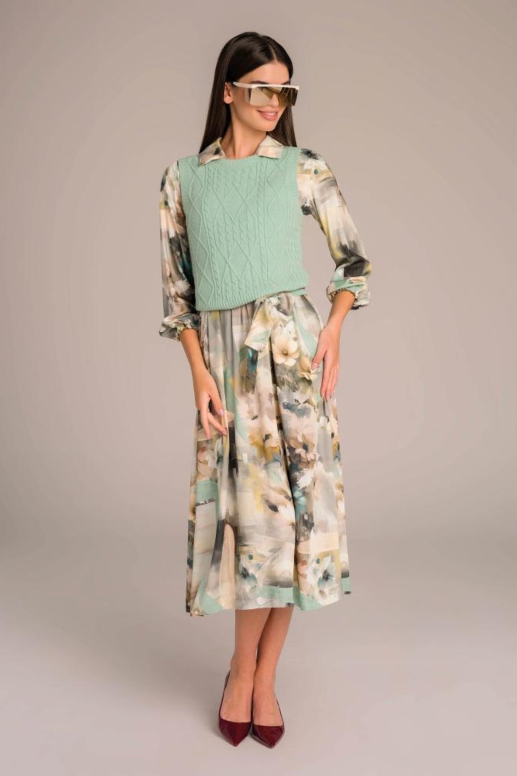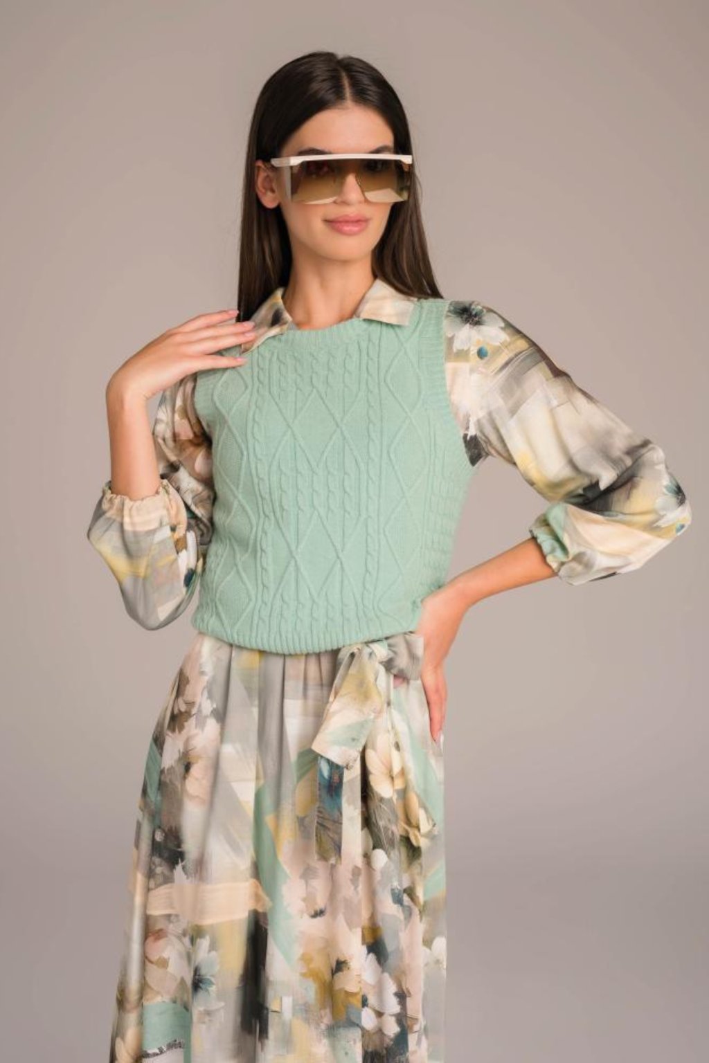 Dámská pletená vesta značky Magenta je stylovým a univerzálním kouskem, který oživí každý outfit. Jemná mintová barva působí svěže a ženský vzhled podtrhují výrazné pletené vzory v kombinaci s hladkým úpletem. Vesta má rovný střih bez rukávů, což umožňuje pohodlné vrstvení přes košile, halenky i šaty. Díky měkkému úpletu je příjemná na nošení a dodá každému outfitu elegantní, ale zároveň ležérní nádech. Snadno ji sladíte do kanceláře i pro volný čas, a díky nadčasovému provedení se stane základem vašeho šatníku.