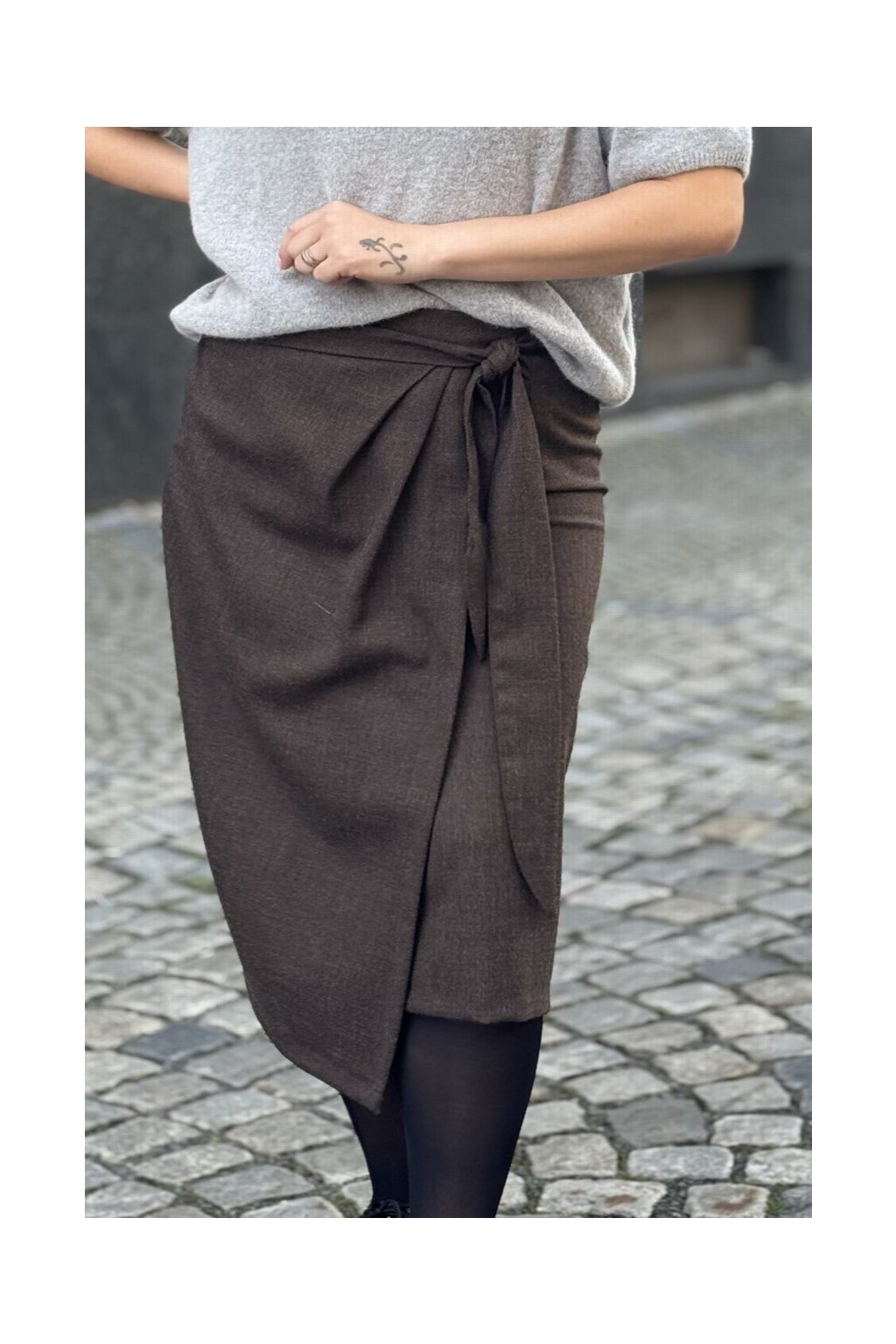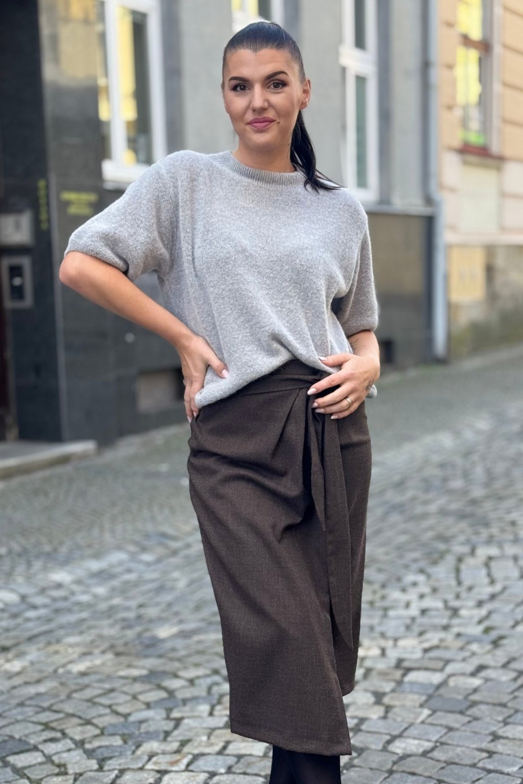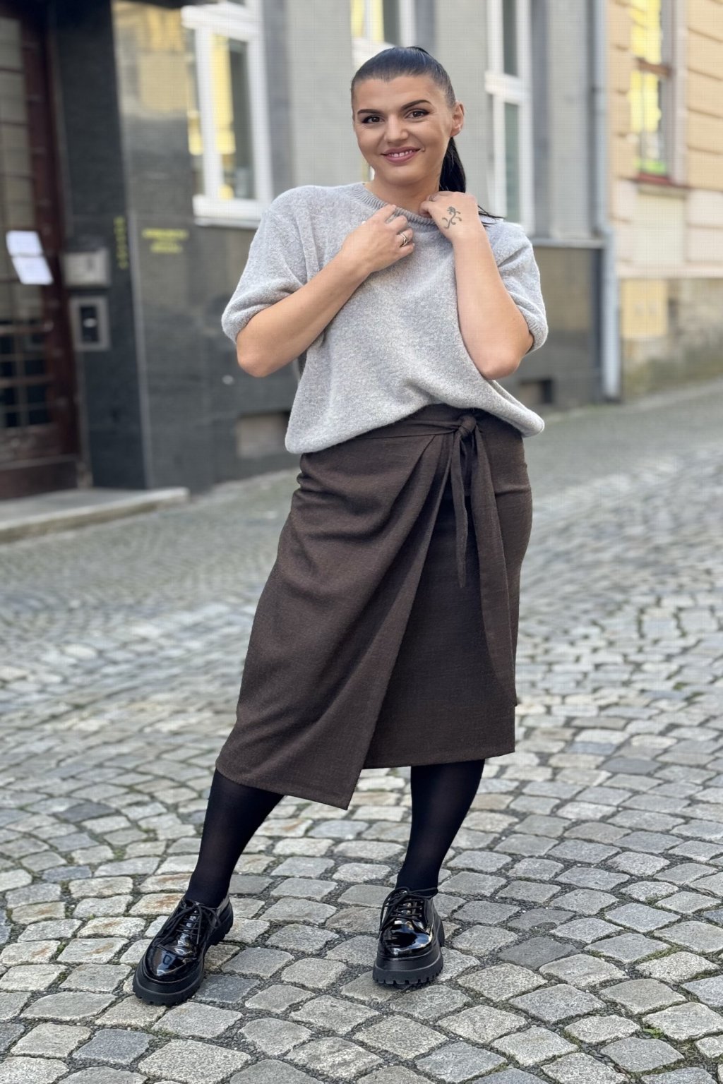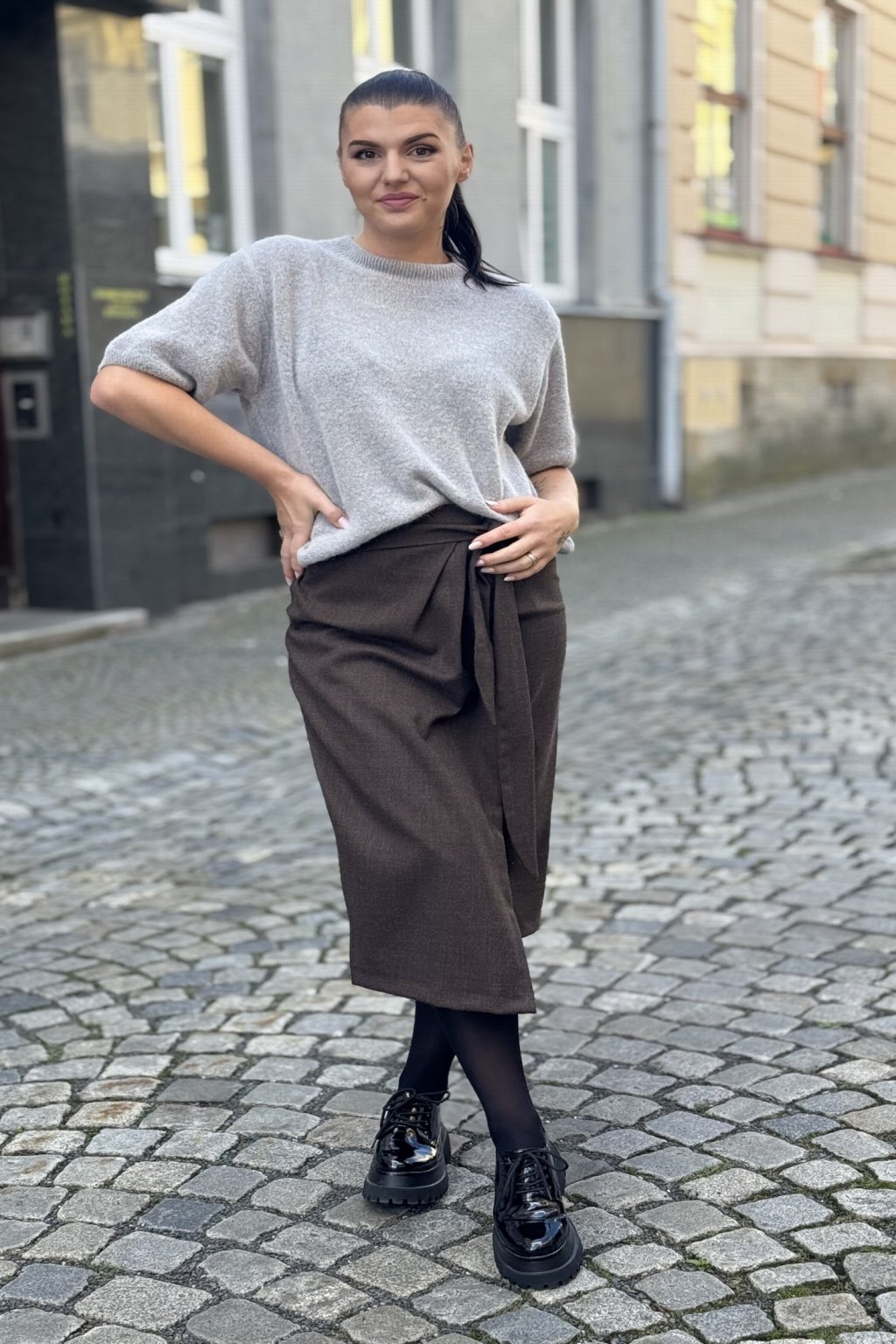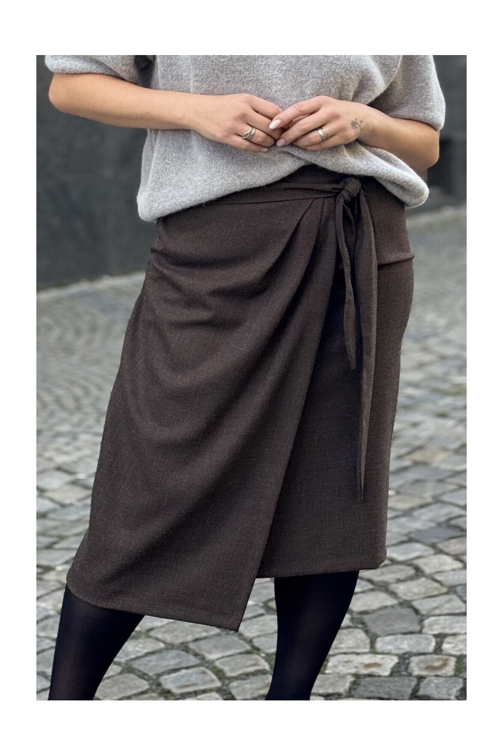 Dámská pouzdrová sukně Imperial je elegantní kousek, který kombinuje nadčasový střih s moderním detailem. Je ušitá z kvalitního materiálu, díky kterému krásně drží tvar a zároveň se pohodlně nosí. Střih do pasu lichotí ženské siluetě a midi délka působí velmi sofistikovaně. Výrazným prvkem je zavinovací efekt s ozdobným vázáním vpředu, který dodává sukni jedinečný šmrnc. Zadní část je řešena decentním rozparkem, jenž zajišťuje volnost pohybu. Hnědý odstín je módní a neutrální, takže se snadno kombinuje s neutrálními i kontrastními barvami.