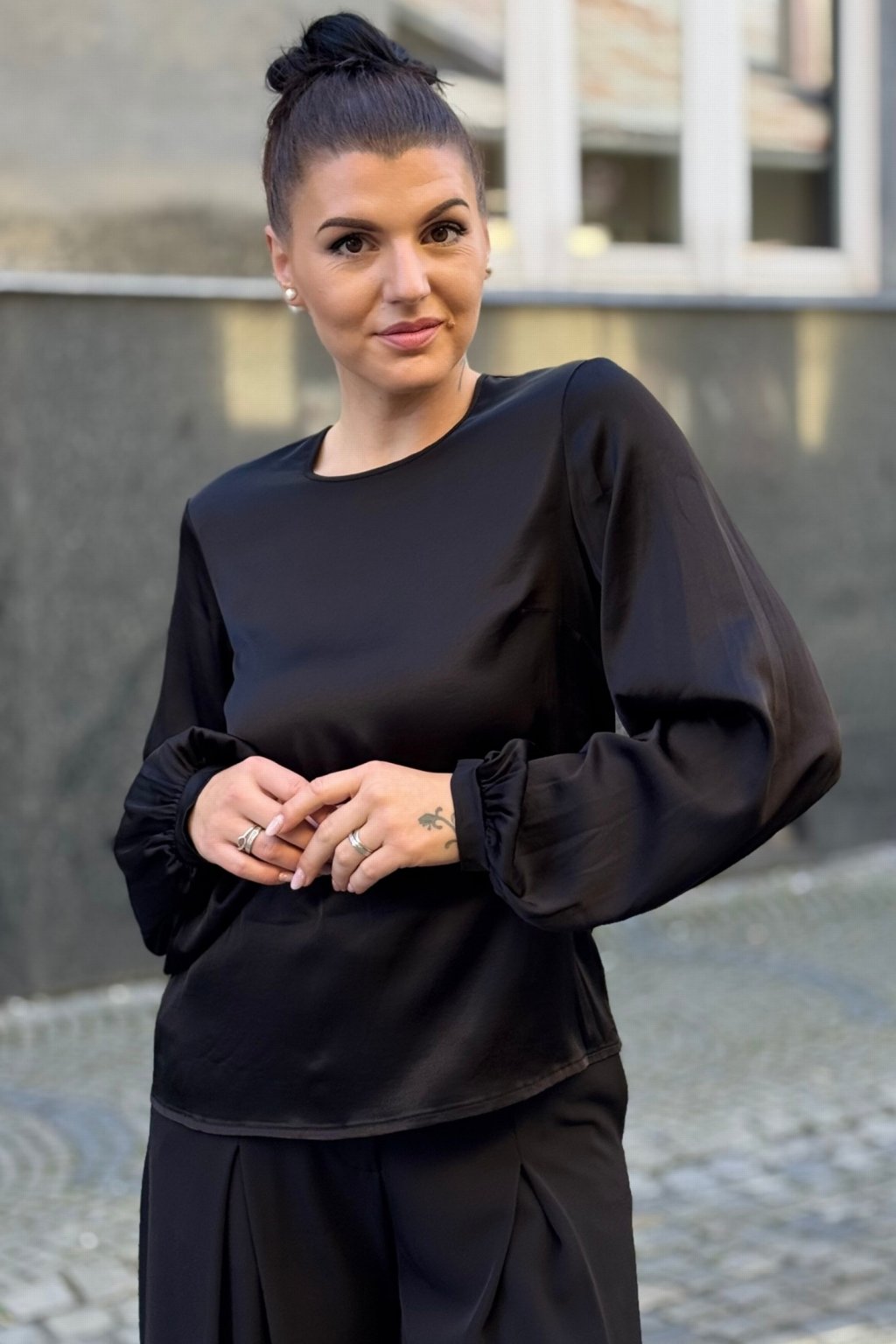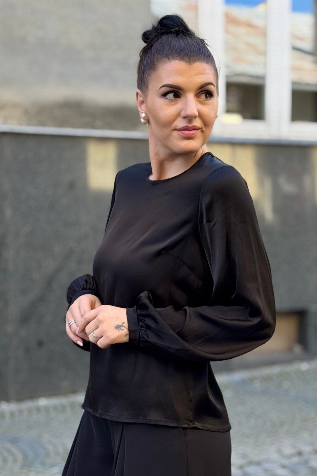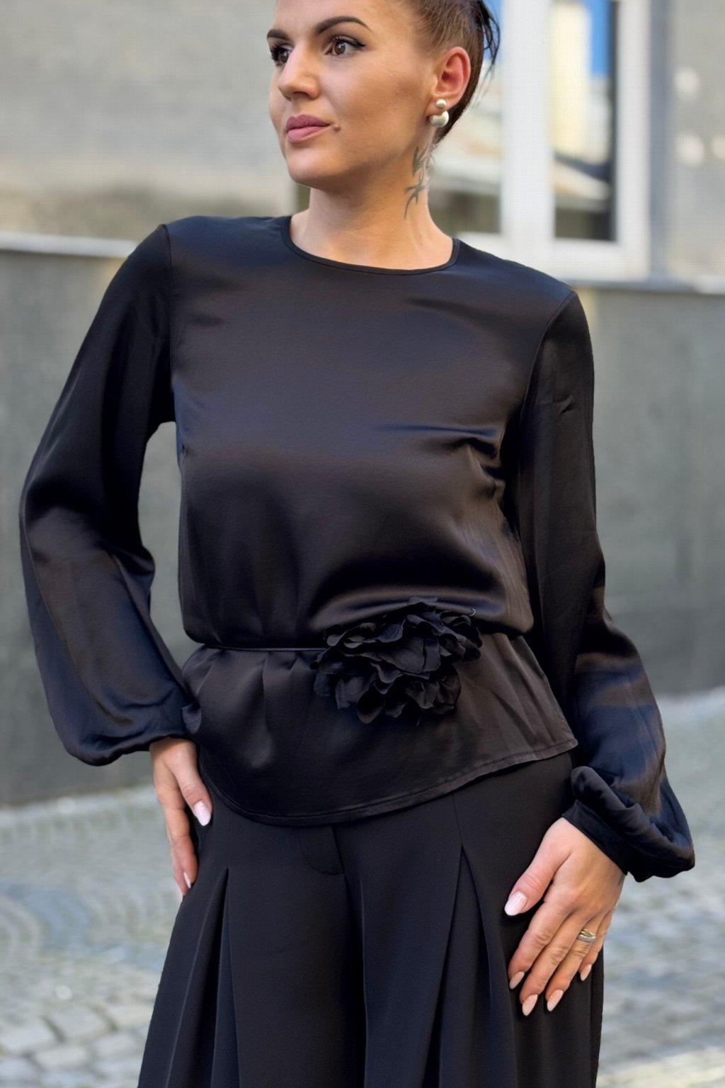 Dámská společenská halenka značky Imperial z jemného viskózového saténu je elegantní a zároveň velmi pohodlná díky přidané elasticitě. Satén s jemným leskem působí luxusně a dodává outfitu slavnostní ráz. Výrazným prvkem je odnímatelná květinová aplikace na šňůrce, kterou můžete umístit dle vlastní fantazie – v pase, na krku jako choker, na ruku jako náramek či dokonce do vlasů. Balónové rukávy s manžetou a decentní zadní rozparek se zapínáním na knoflíček podtrhují ženskou jemnost a smysl pro detail. Halenka je ideální volbou pro společenské události, oslavy i večerní příležitosti.
