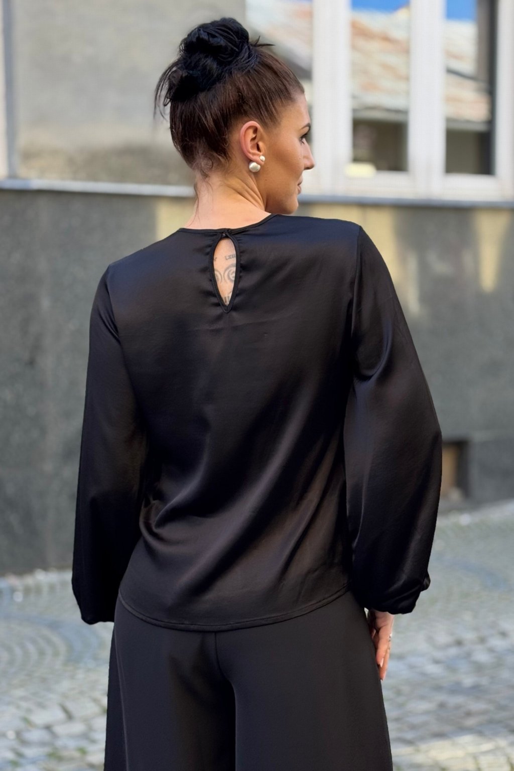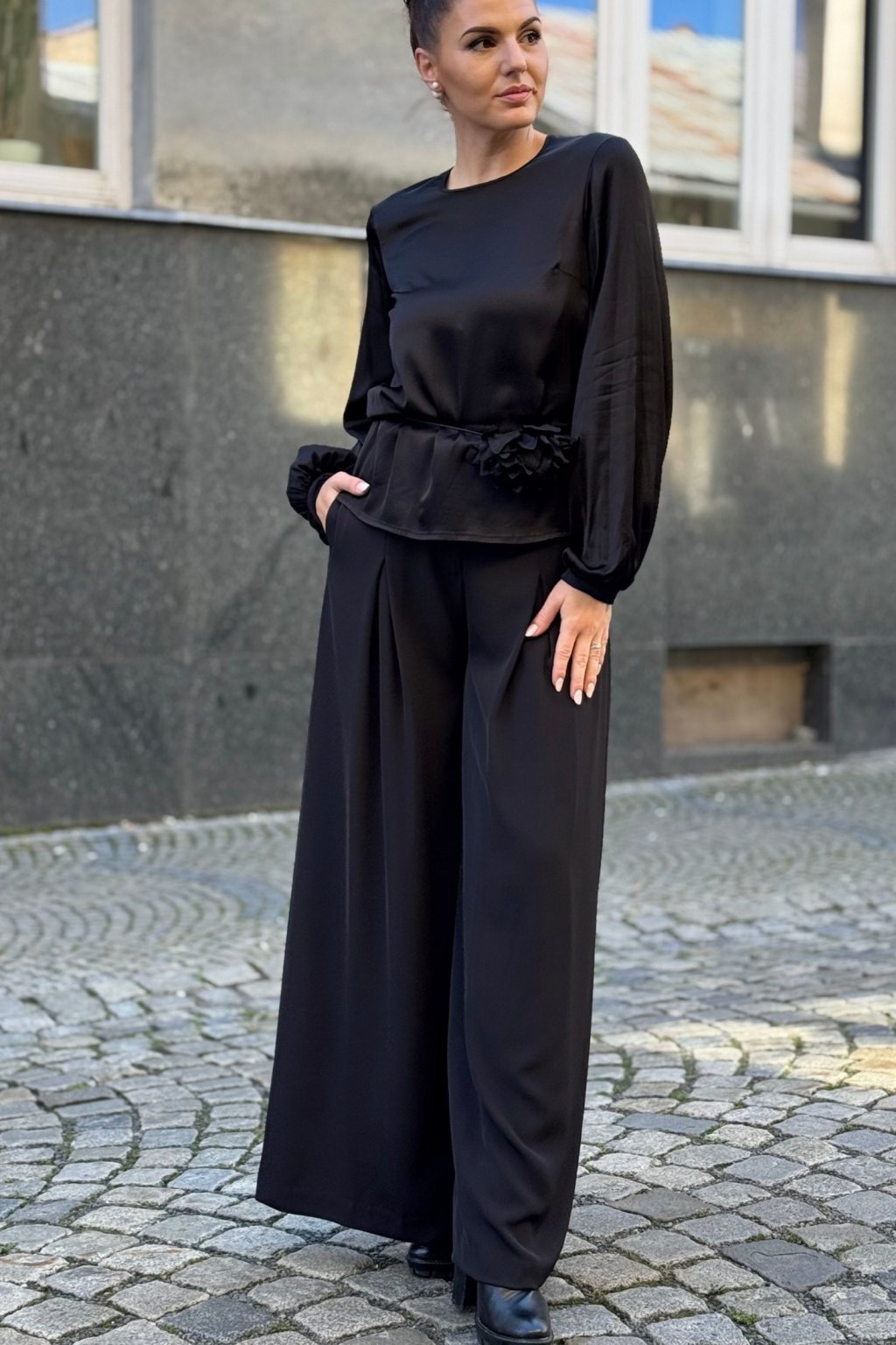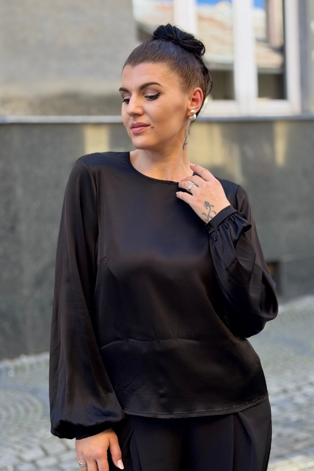 Dámská společenská halenka značky Imperial z jemného viskózového saténu je elegantní a zároveň velmi pohodlná díky přidané elasticitě. Satén s jemným leskem působí luxusně a dodává outfitu slavnostní ráz. Výrazným prvkem je odnímatelná květinová aplikace na šňůrce, kterou můžete umístit dle vlastní fantazie – v pase, na krku jako choker, na ruku jako náramek či dokonce do vlasů. Balónové rukávy s manžetou a decentní zadní rozparek se zapínáním na knoflíček podtrhují ženskou jemnost a smysl pro detail. Halenka je ideální volbou pro společenské události, oslavy i večerní příležitosti.