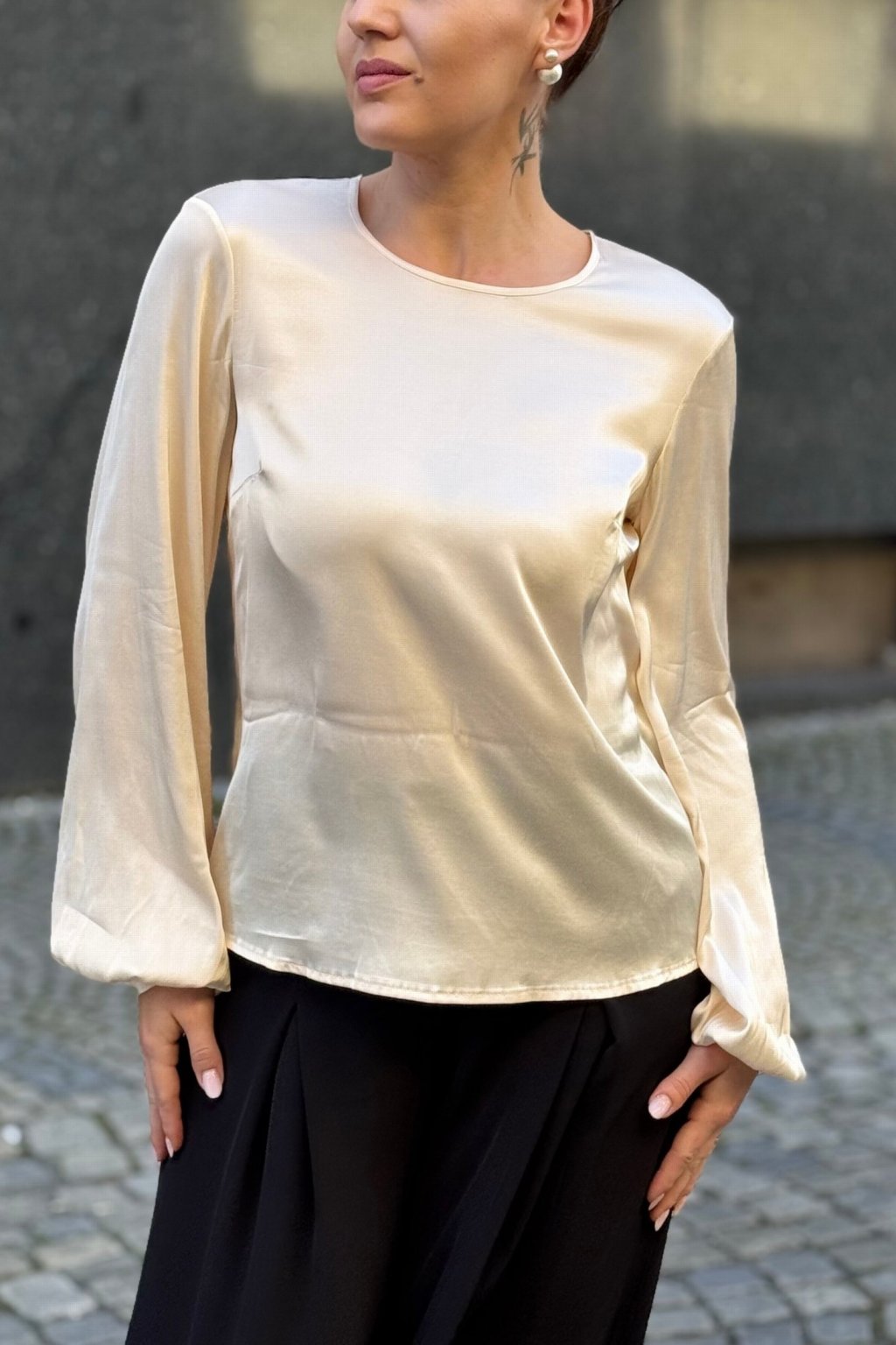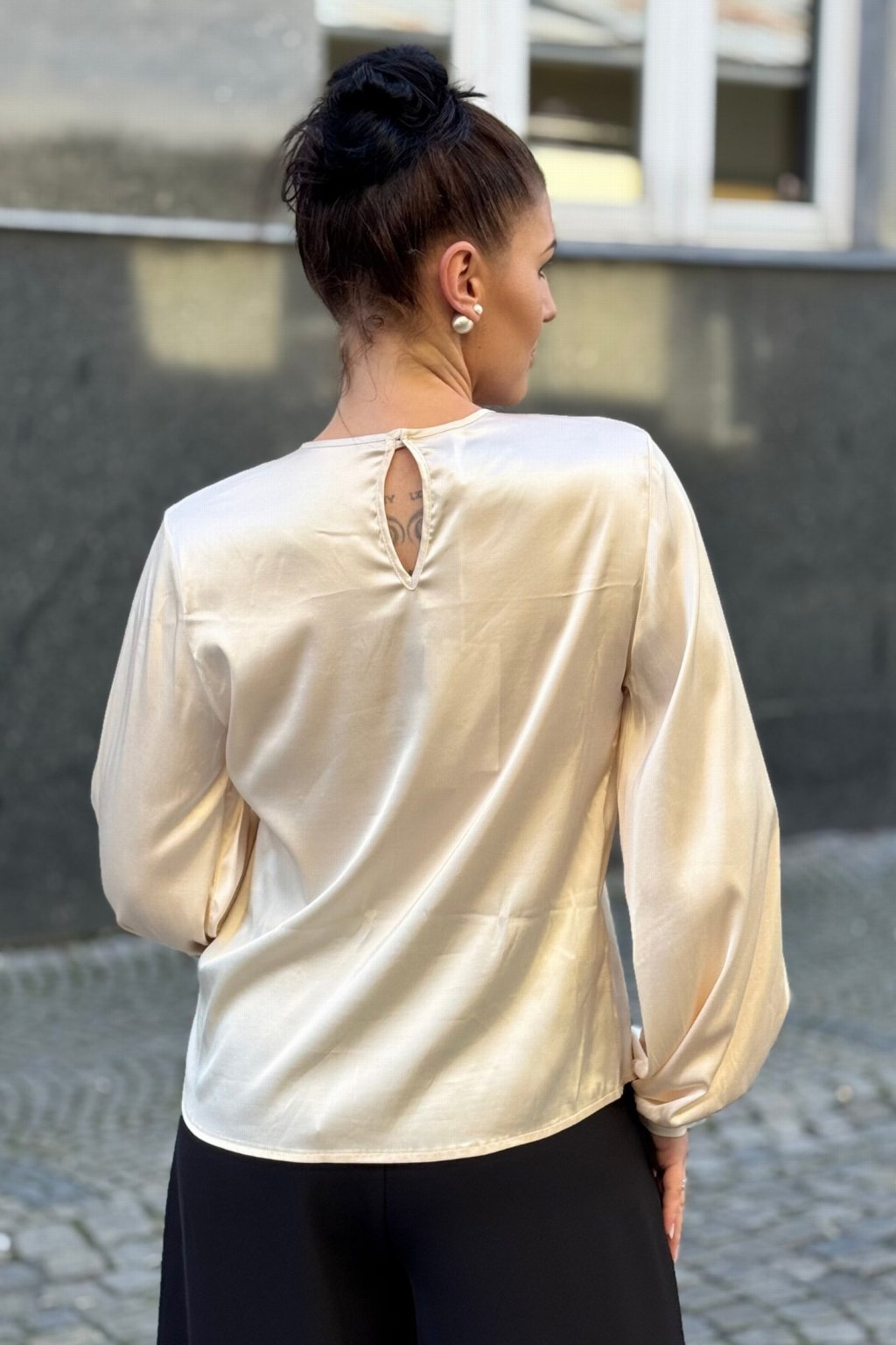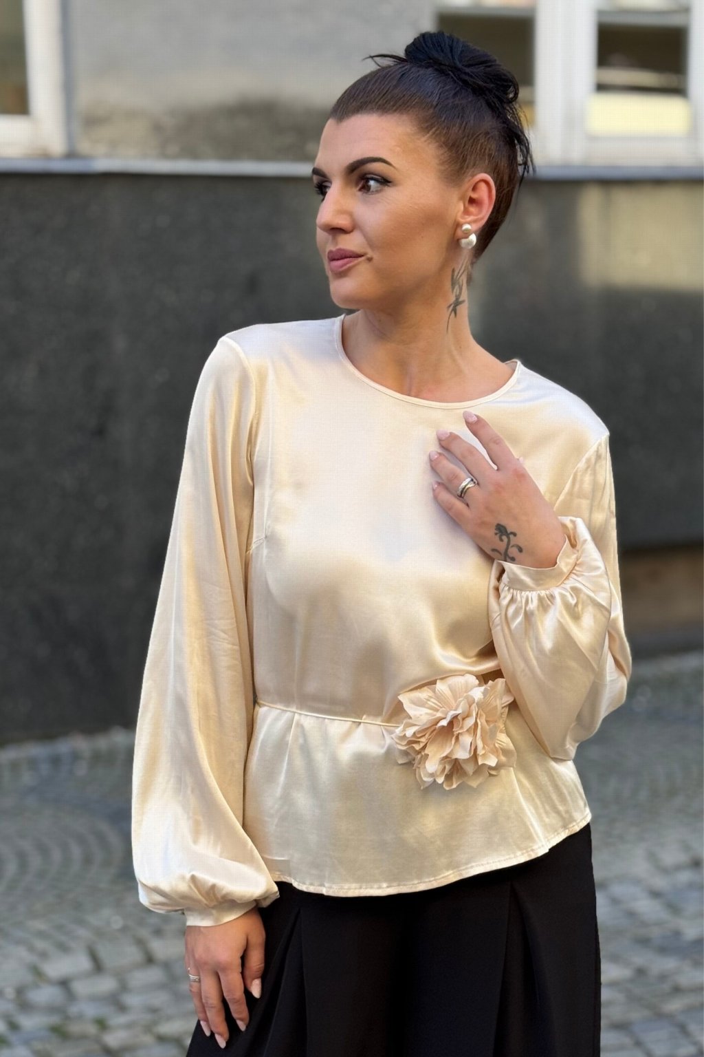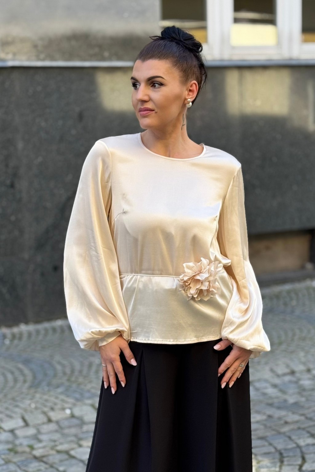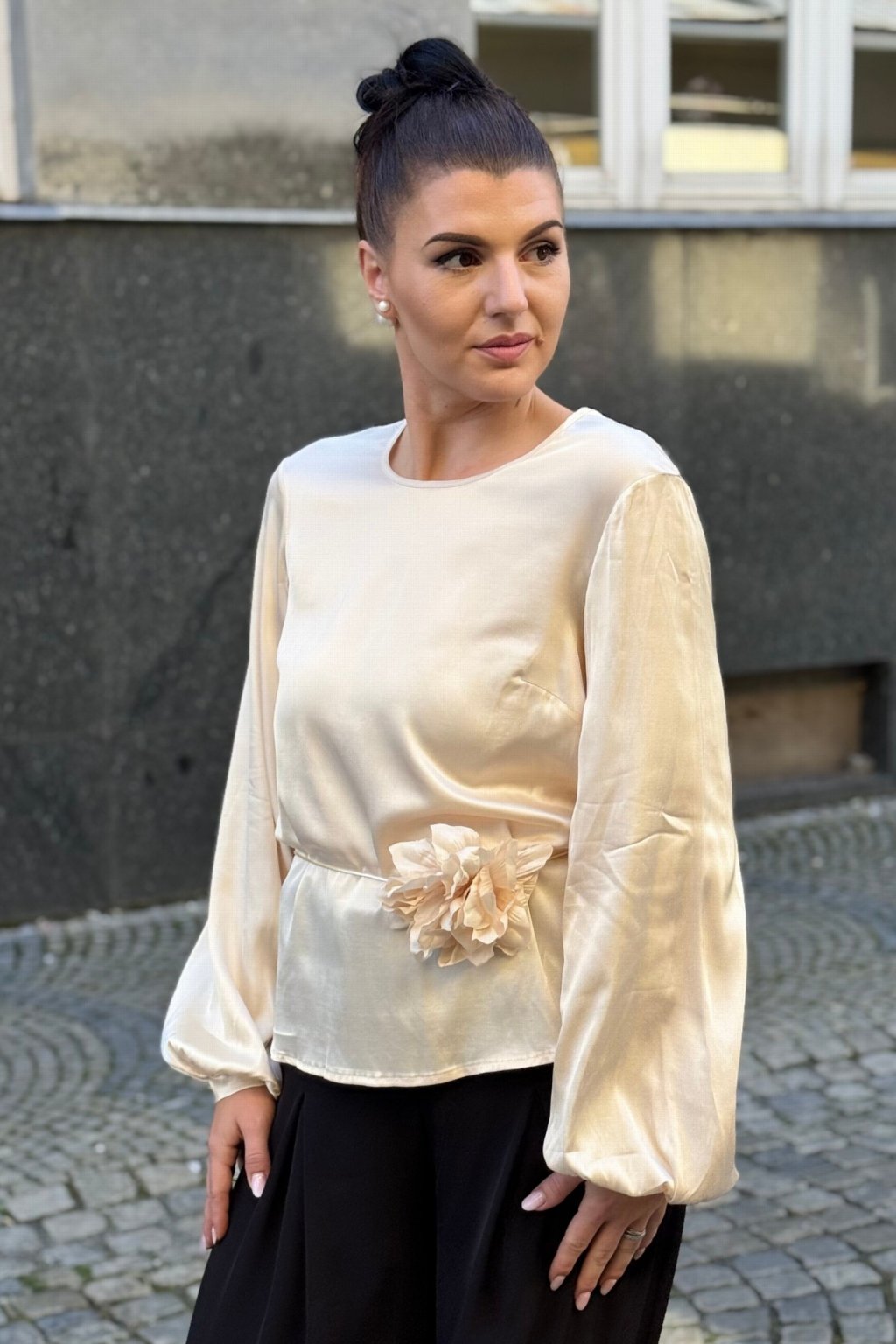 Dámská společenská halenka značky Imperial z jemného viskózového saténu je elegantní a zároveň velmi pohodlná díky přidané elasticitě. Satén s jemným leskem působí luxusně a dodává outfitu slavnostní ráz. Výrazným prvkem je odnímatelná květinová aplikace na šňůrce, kterou můžete umístit dle vlastní fantazie – v pase, na krku jako choker, na ruku jako náramek či dokonce do vlasů. Balónové rukávy s manžetou a decentní zadní rozparek se zapínáním na knoflíček podtrhují ženskou jemnost a smysl pro detail. Halenka je ideální volbou pro společenské události, oslavy i večerní příležitosti.