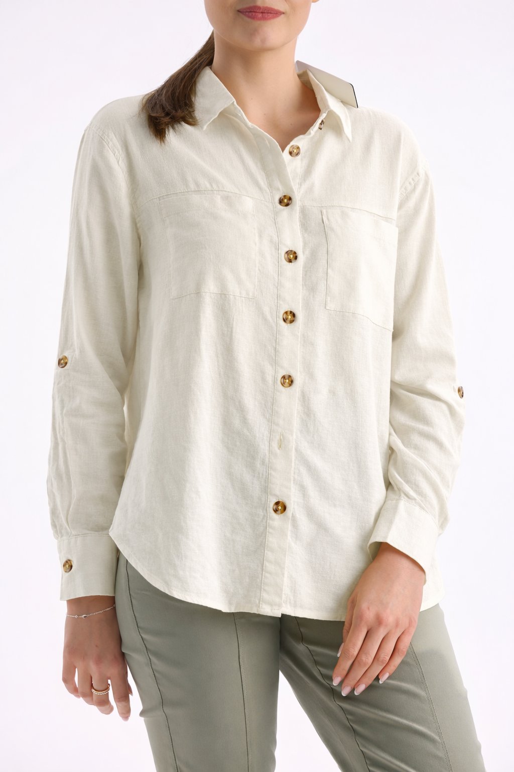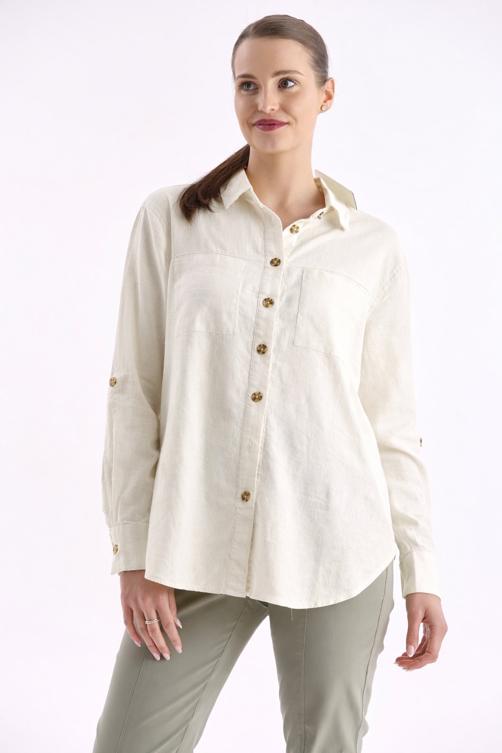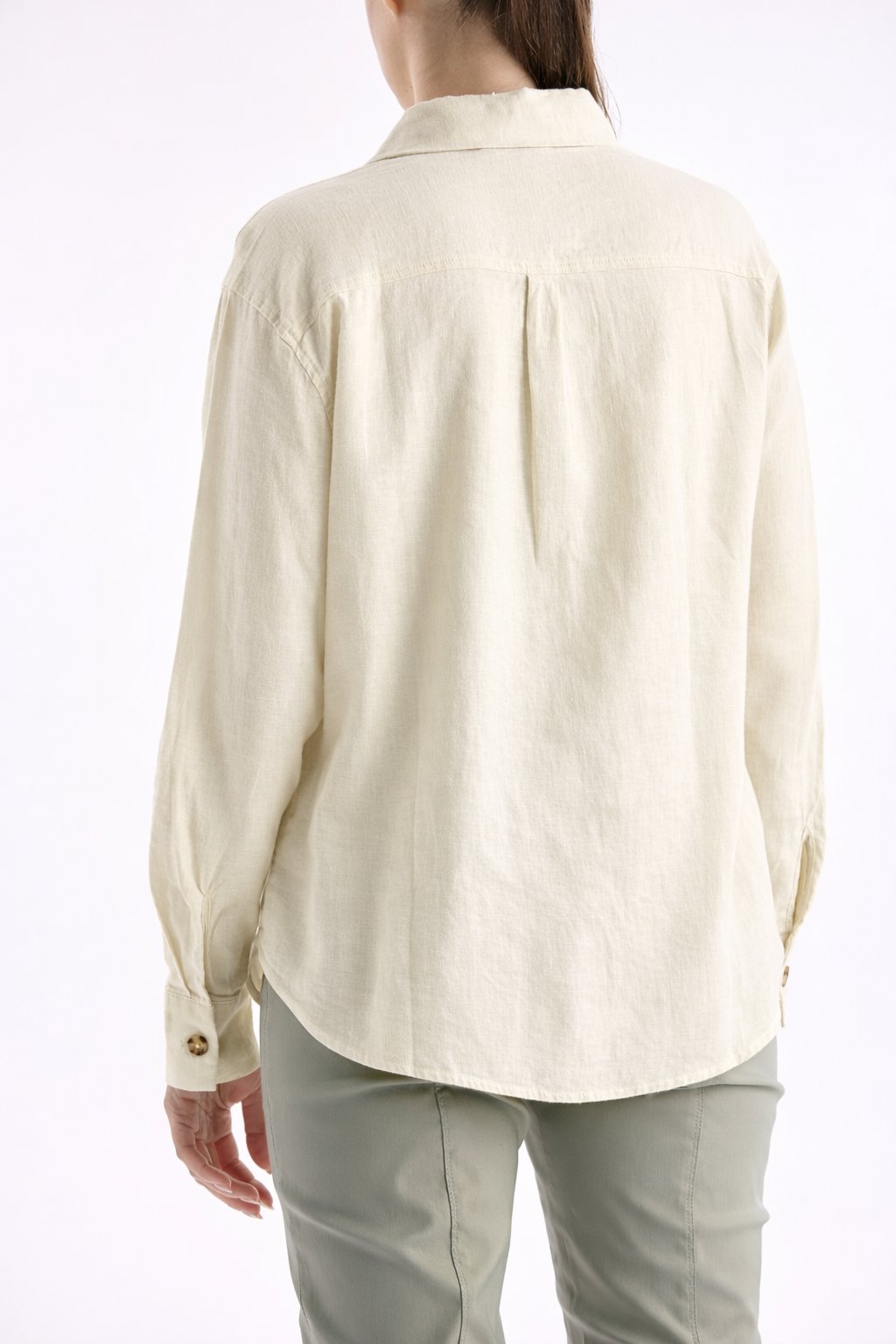 Dámská košile Navigazione v krásném přírodním odstínu je nadčasový a velmi oblíbený kousek, který v sobě spojuje lehkost, ženskou eleganci a maximální pohodlí při nošení. Příjemná směs 55 % lnu a 45 % viskózy zajišťuje vzdušnost, jemnost a komfort i během teplejších dnů. Košile má uvolněnější střih, klasický límeček, zapínání na knoflíky a výrazné náprsní kapsy, které jí dodávají moderní a ležérně elegantní vzhled. Praktickým detailem jsou také rukávy s možností ohrnutí a upevnění, takže ji snadno přizpůsobíte svému stylu i počasí. Dámská lněná košile Navigazione se skvěle hodí k džínám, plátěným kalhotám i elegantnějším outfitům a stane se univerzálním základem šatníku.