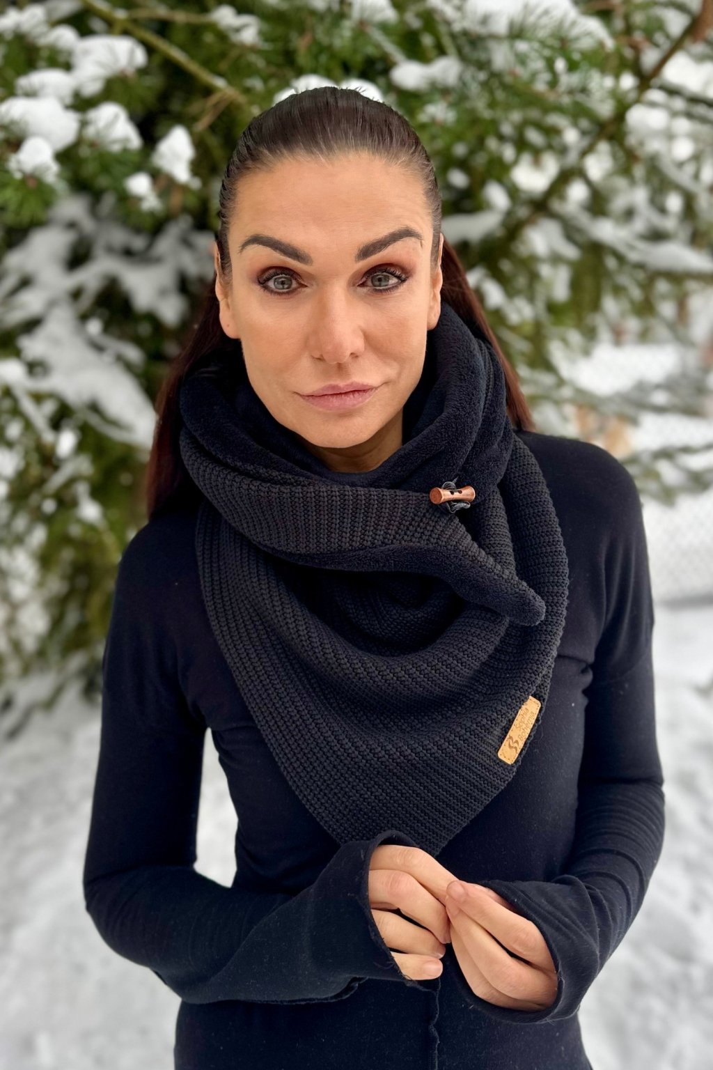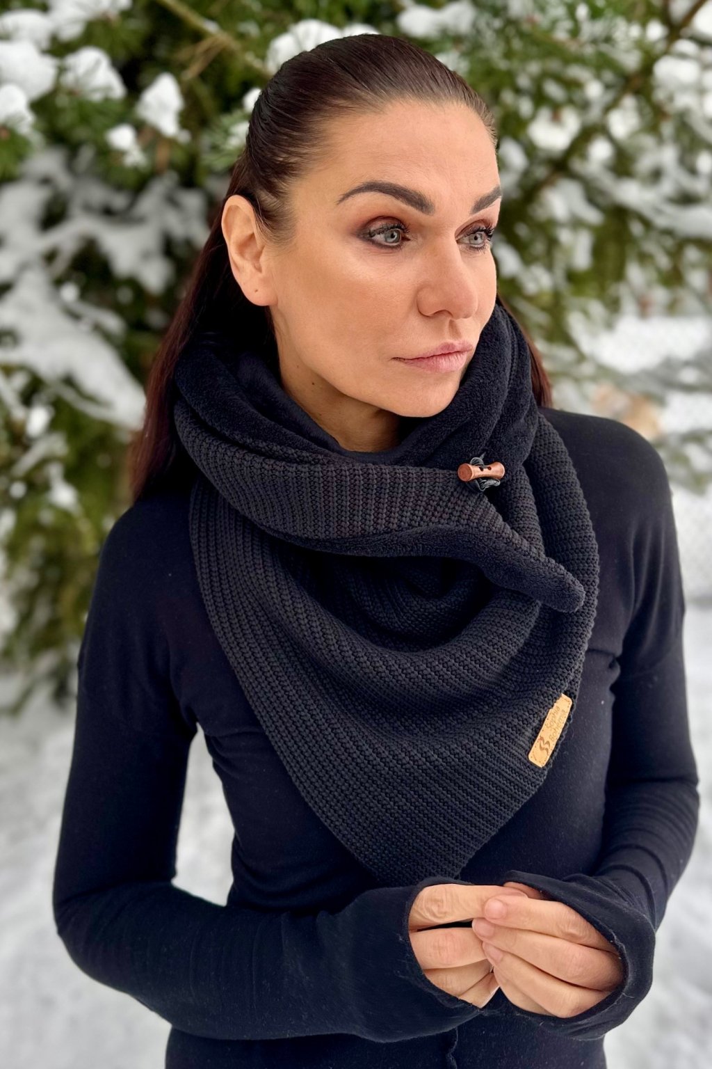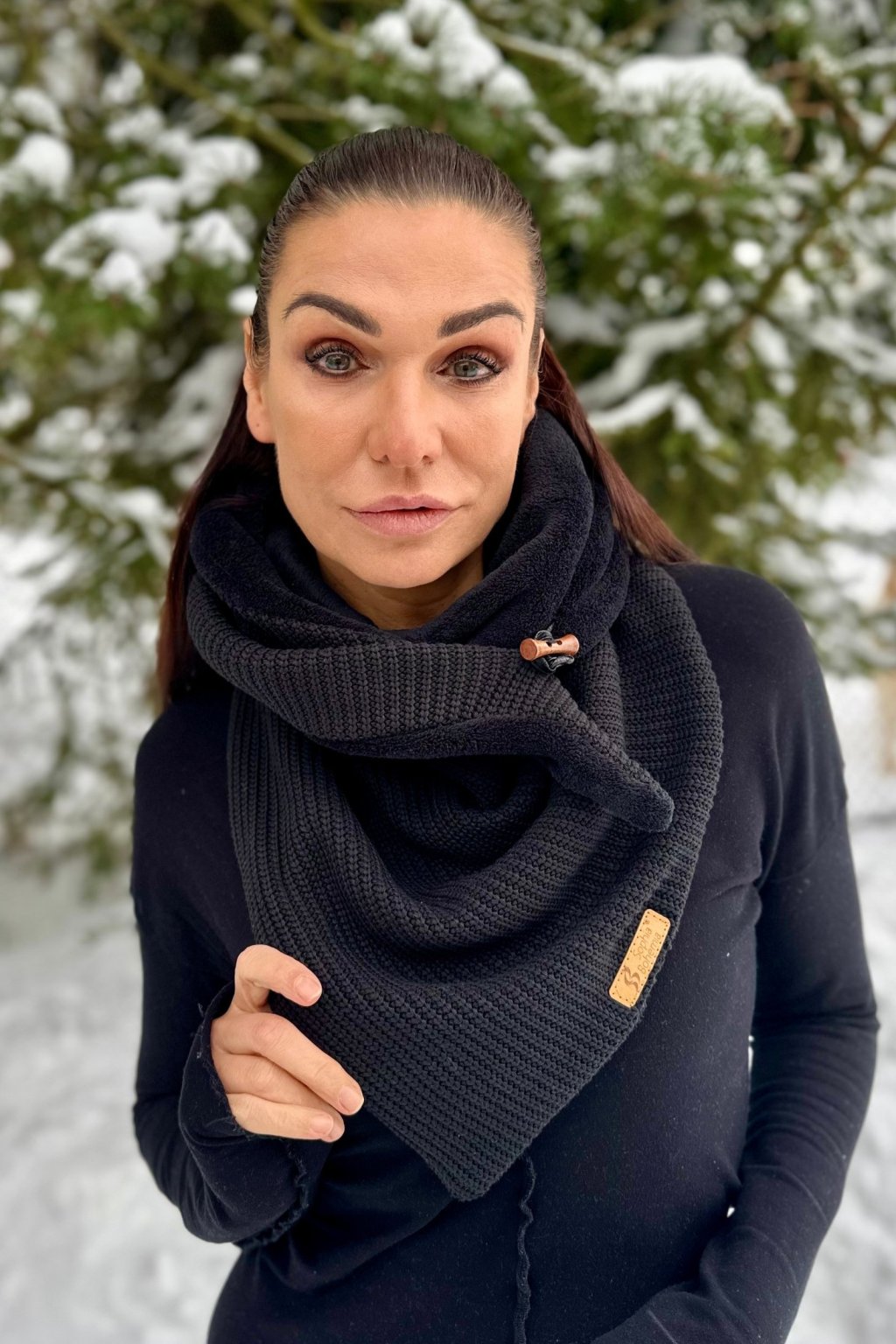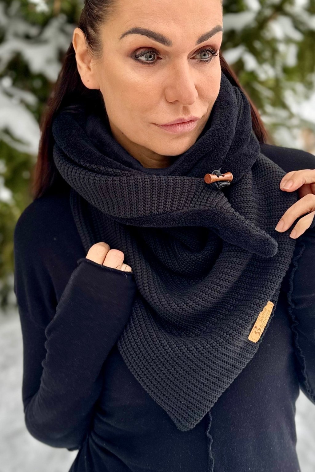 Dámská šála na zapínání má tvar trojúhelníku a je vyrobena z kombinace hrubé svetroviny a fleecu s chlupem. Šála je dlouhá 150 cm a v nejširším místě má 65 cm, takže je dostatečně veliká, aby jste se do ní mohly zabalit jako do peřiny. A nádherně hřeje!