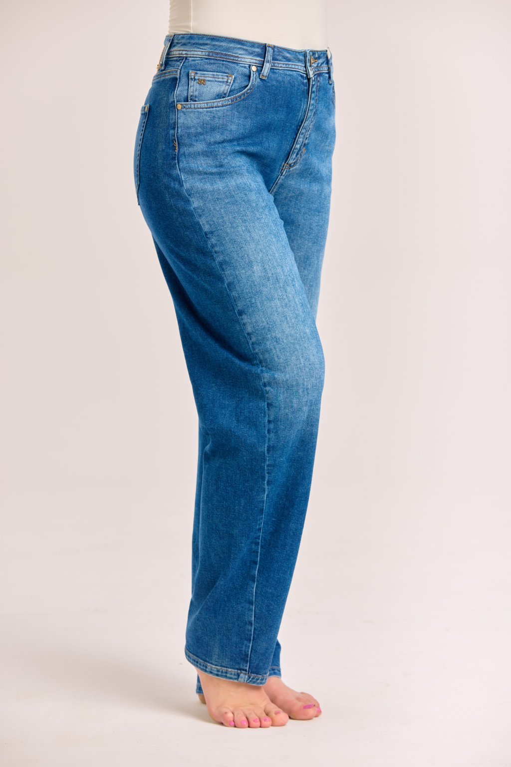 moderní barelový střih s širší linií nohavic