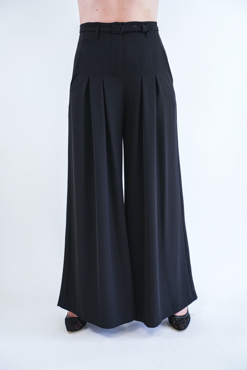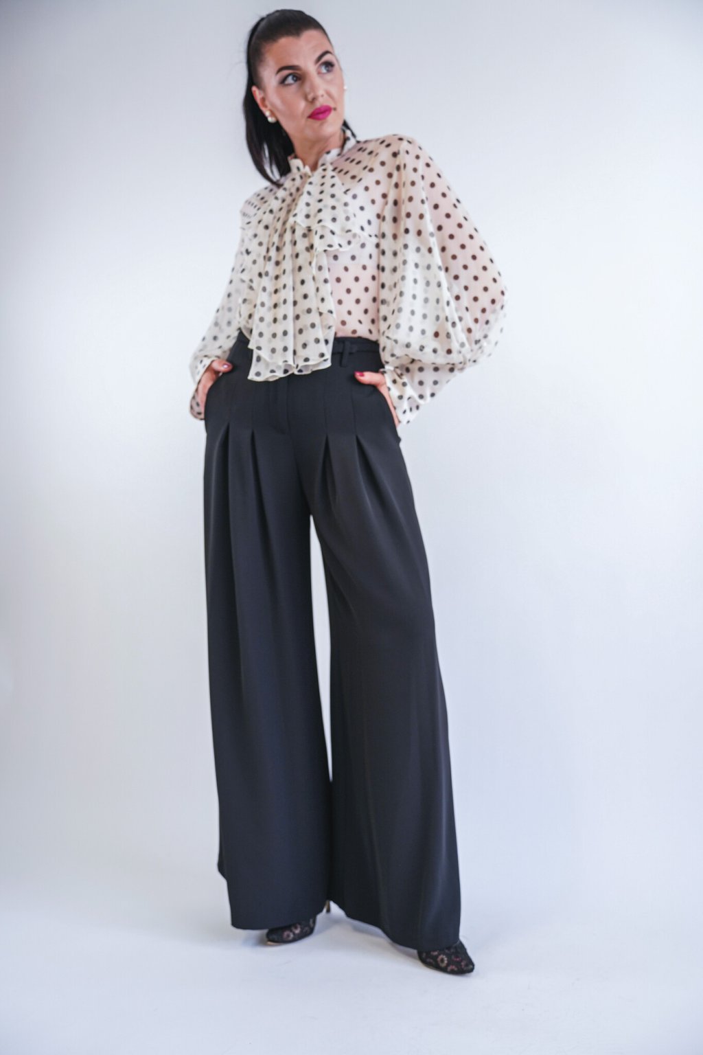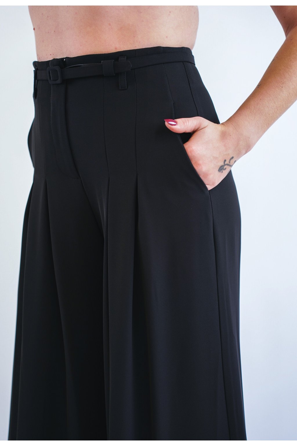 Dámské kalhoty značky Imperial zaujmou svým elegantním a nadčasovým střihem. Mají vysoký pas, výrazné sklady a extra široké nohavice, které působí velmi stylově a opticky prodlužují postavu. Velikou předností tohoto střihu je fakt, že jsou sklady v pase prošité a kalhoty se rozšiřují až v oblasti stehen. Kalhoty vám v oblasti bříška tedy nepřidají ani cm. Zapínání je doplněno o pásek ve stejné barvě, který podtrhuje ženskou siluetu. Tento model se skvěle kombinuje se sakem, halenkou i elegantním topem, a hodí se tak do práce, na schůzky i společenské příležitosti.