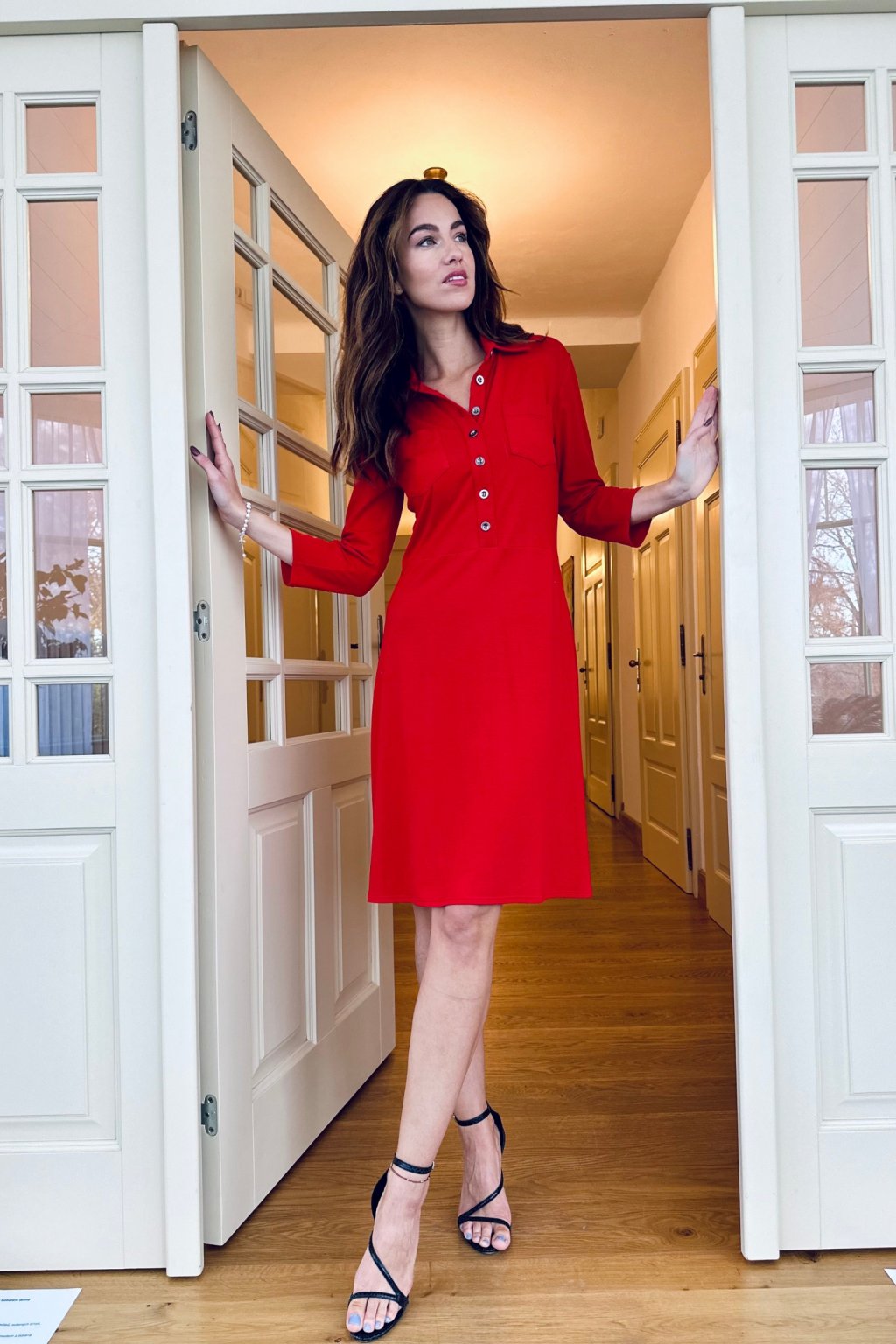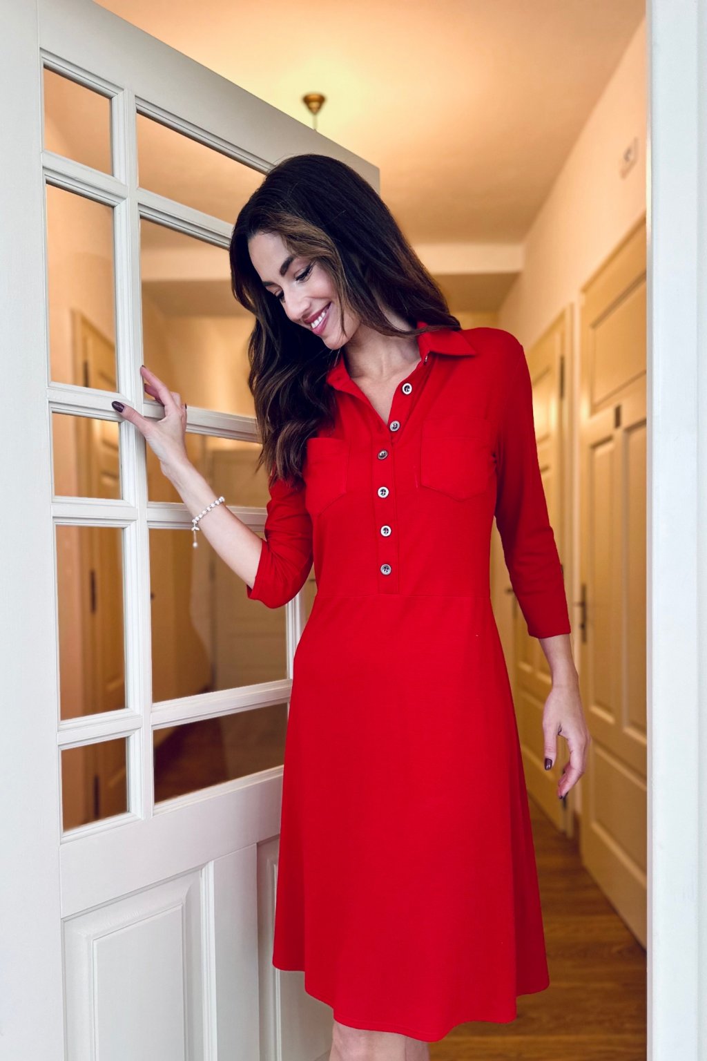 Dámské košilové šaty s rozepínáním na knoflíky do pasu, ozdobné dvěma kapsami na předním díle. Tyto dámské šaty jsou s límečkem a mají áčkový tvar sukně. Šaty doporučujeme prát v pračce na 30 st.. Pokud potřebujete upravit délku šatů a rukávů, napište požadovanou délku do poznámky.