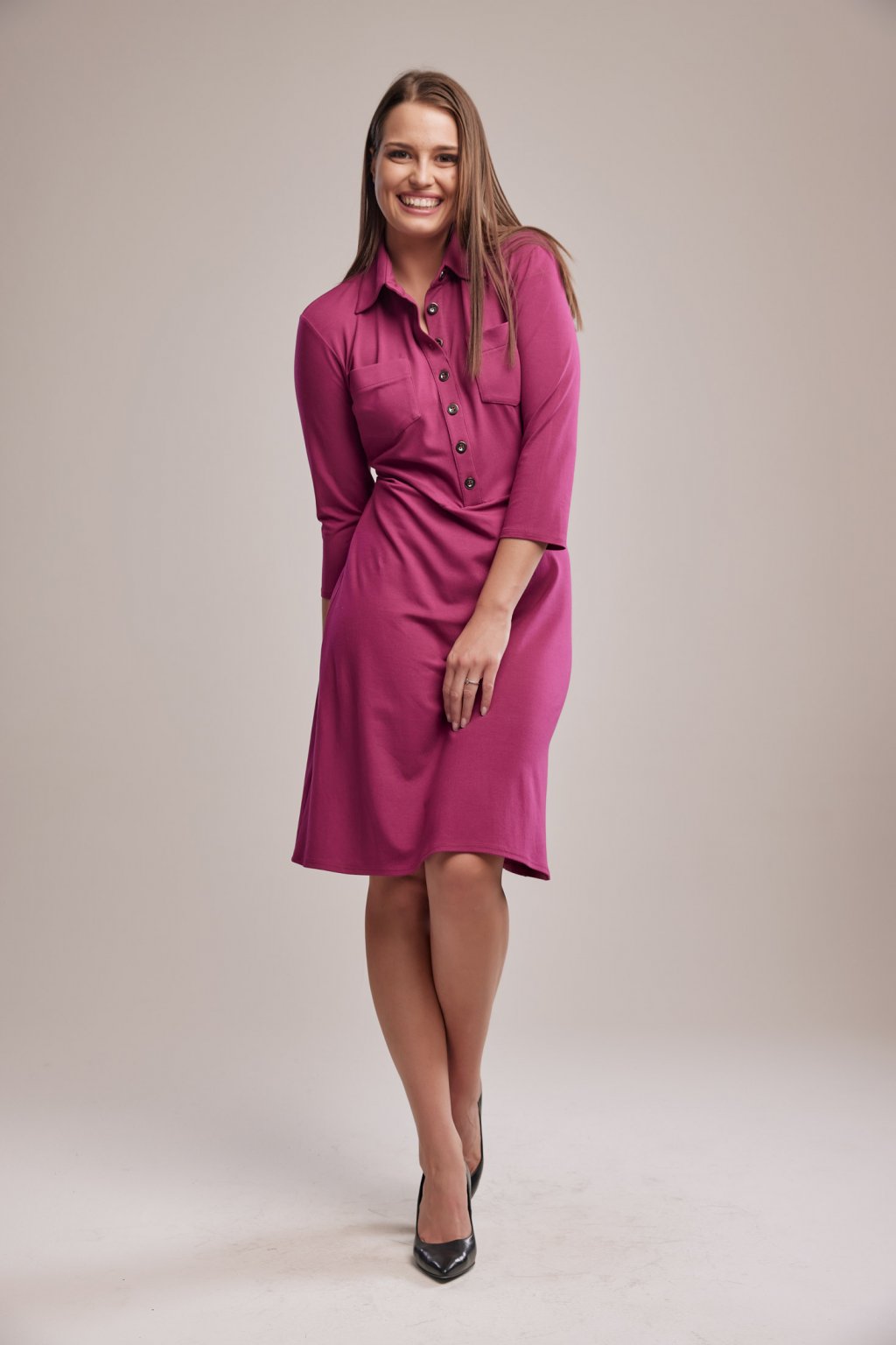 Dámské košilové šaty s rozepínáním na knoflíky do pasu, ozdobné dvěma kapsami na předním díle. Tyto dámské šaty jsou s límečkem a mají áčkový tvar sukně. Šaty doporučujeme prát v pračce na 30 st.. Pokud potřebujete upravit délku šatů a rukávů, napište požadovanou délku do poznámky.