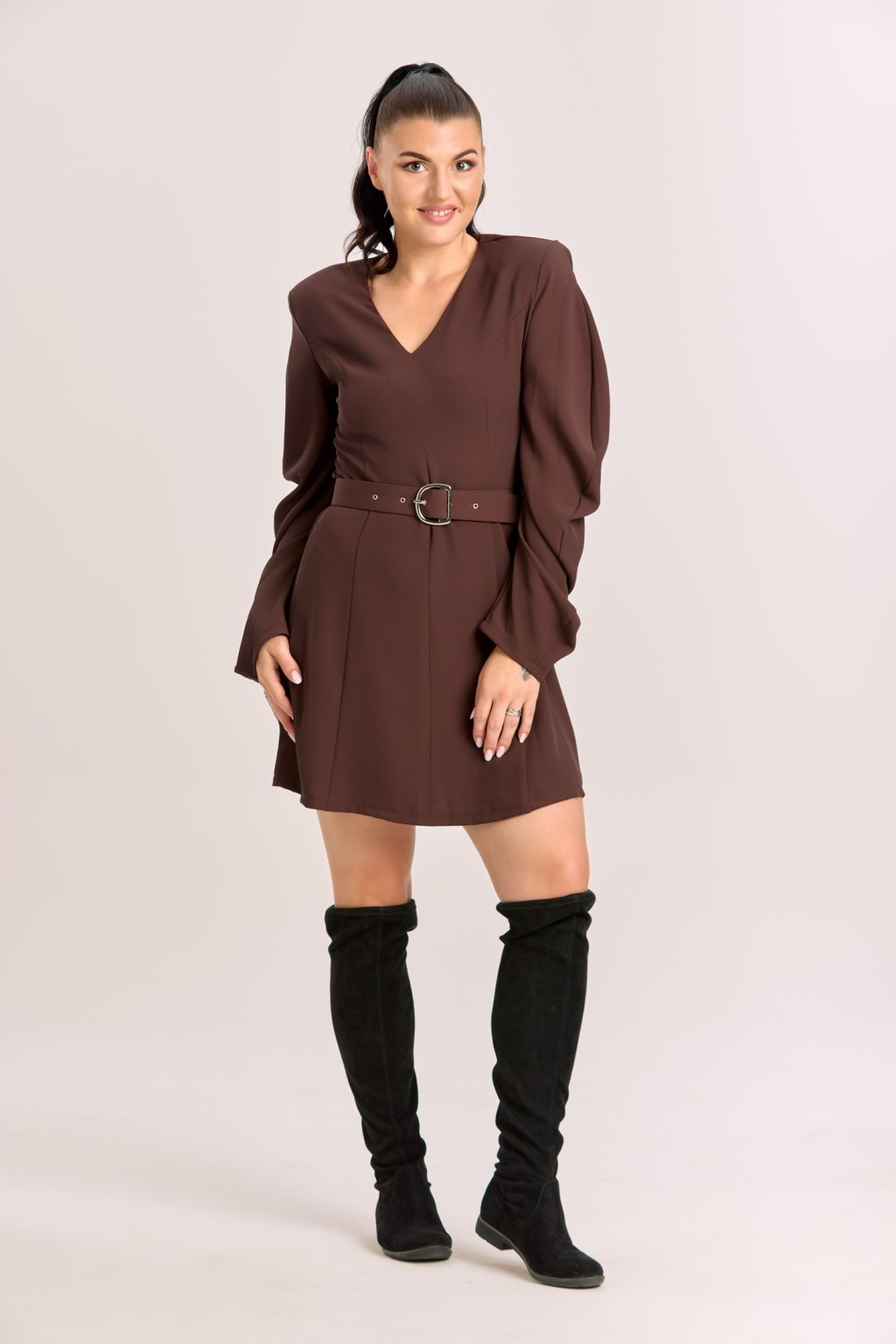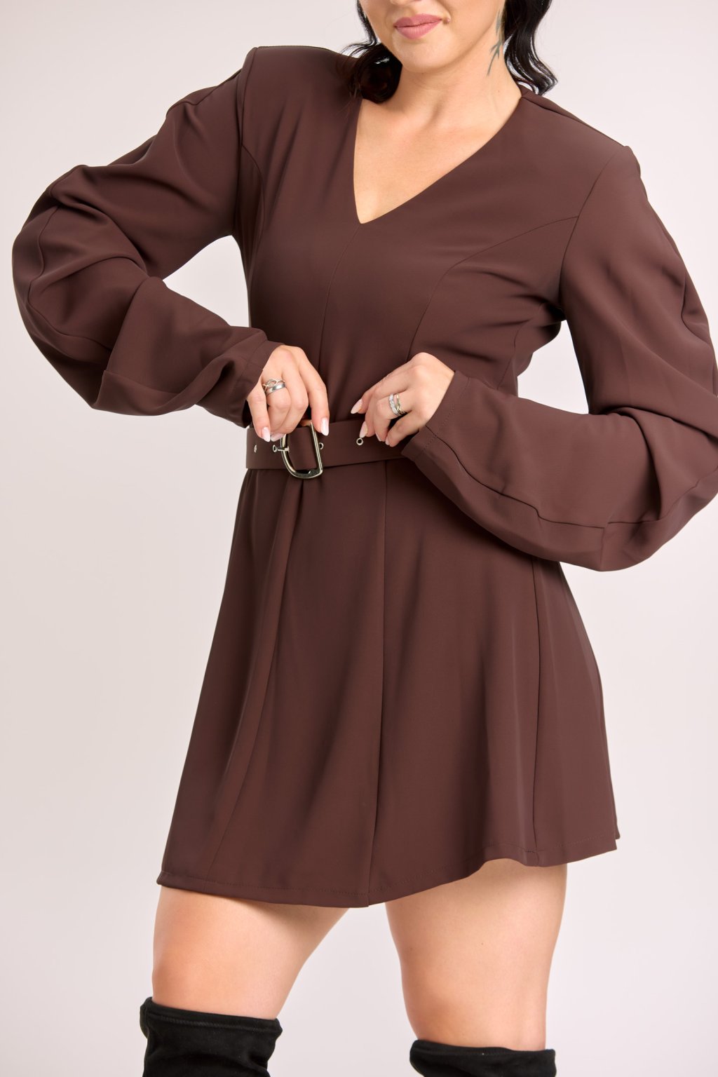 Dámské mini šaty značky Imperial v elegantním hnědém odstínu představují stylový kousek, který podtrhne ženskost a dodá outfitu moderní nádech. Rovný střih se zvýrazní díky pásku s kovovou sponou, který krásně tvaruje siluetu. Výrazným prvkem jsou dlouhé balonové rukávy, jež působí hravě a zároveň elegantně. Výstřih do „V“ opticky prodlužuje postavu a dodává šatům rafinovaný vzhled. Díky univerzálnímu designu se hodí jak na denní nošení, tak na večerní příležitosti – stačí zvolit vhodné doplňky.