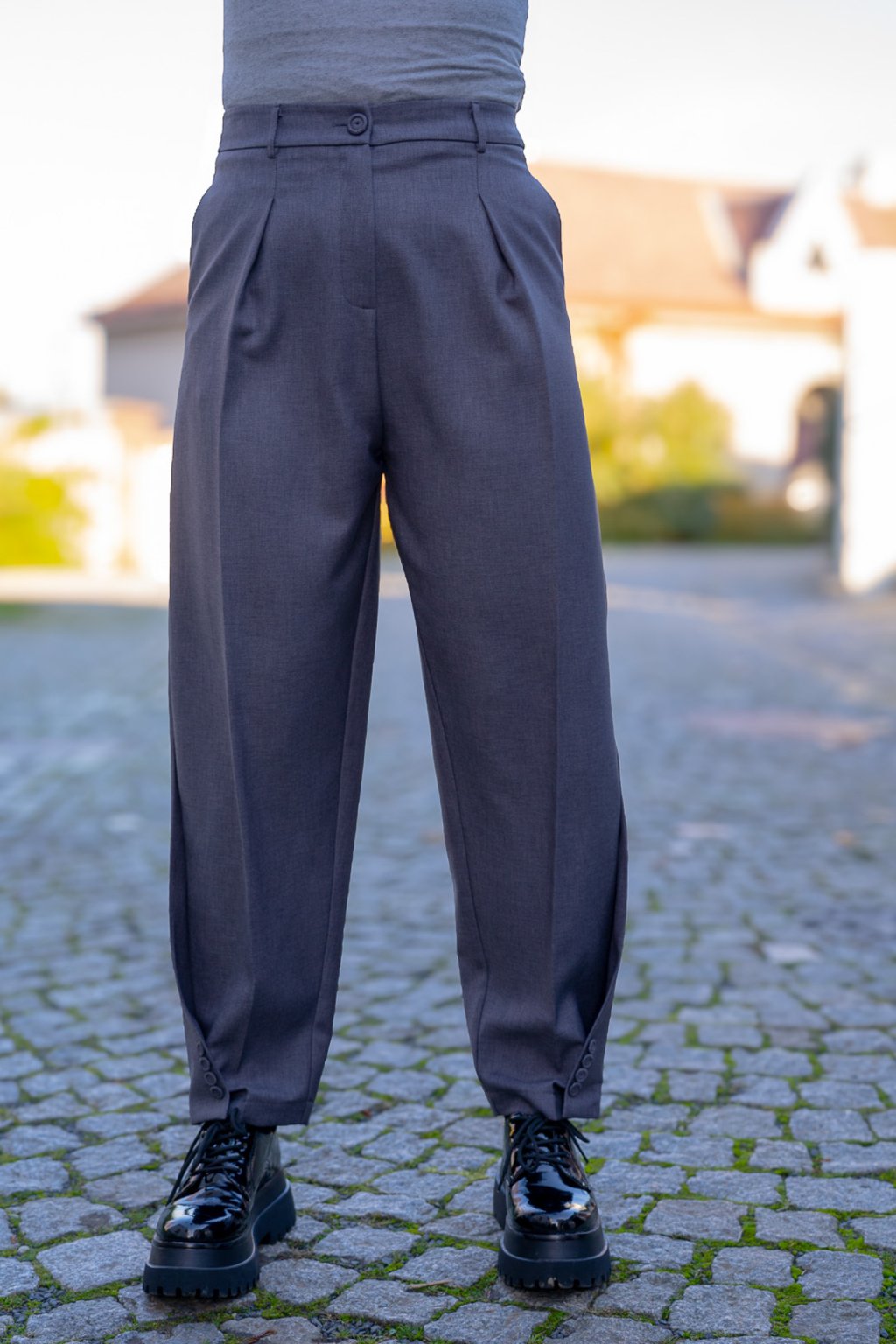 Dámské kalhoty značky Imperial Fashion vynikají moderním střihem, prémiovým zpracováním a nadčasovým stylem. Jsou vyrobeny z kvalitní směsi materiálů, která zajišťuje perfektní padnutí, tvarovou stálost a maximální komfort při nošení. Elegantní volnější střih s vysokým pasem a záhyby v přední části opticky prodlužuje nohy a dodává postavě ženskou siluetu. Styl dotváří boční kapsy a ozdobné knoflíky ve spodní části nohavic, které působí originálně a sofistikovaně.