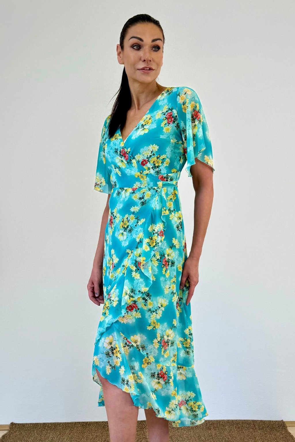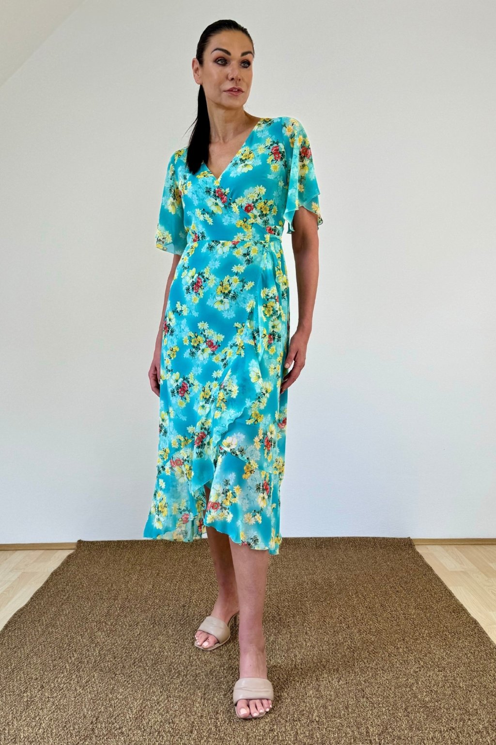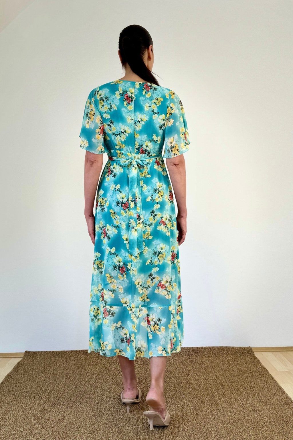 Dámské šifonové šaty mají krátký zvonkový rukáv a véčkový výstřih. Střih těchto šatů je zavinovací. 3aty jsou ozdobené jemným volánem, který šatům dodává ženskost a romantický vzhled, který k létu neodmyslitelně patří. Šaty jsou podšité jemnou viskózovou tkaninou. Délka šatů i rukávů je ozdobená jemným oentlováním. Šaty jsou ušity z nádherné šifonové tkaniny, která je velmi vzdušná a stálobarevná. Pokud budete chtít upravit délku šatů na míru, napište svůj požadavek do poznámky.