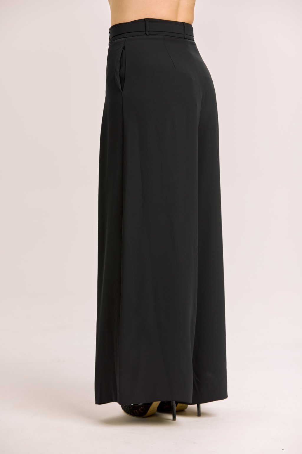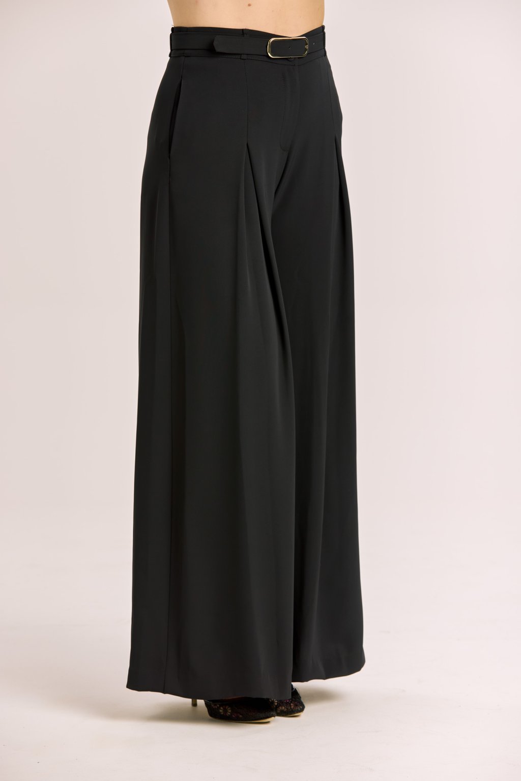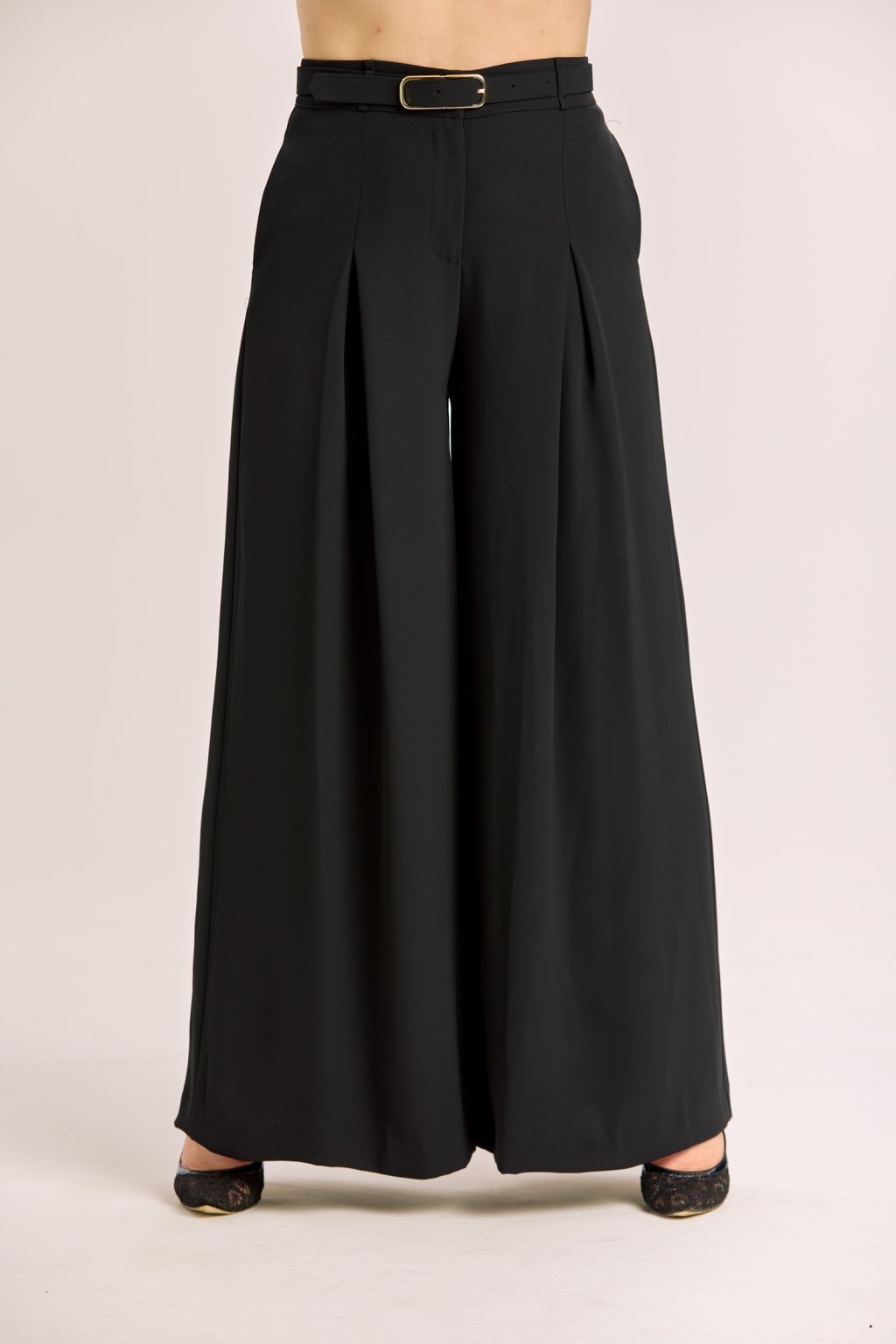 Dámské černé kalhoty Imperial v širokém elegantním střihu jsou navržené tak, aby podtrhly ženskou siluetu a zároveň poskytly maximální komfort. Vysoký pas opticky prodlužuje nohy a díky odšitým skladům v oblasti břicha nepřidává na objemu, takže působí velmi lichotivě. Splývavý materiál dodává kalhotám vzdušnost a lehkost, takže se hodí jak na každodenní nošení, tak i na společenské příležitosti. Stylový pásek s kovovou sponou je součástí modelu a dodává celku elegantní akcent. Kalhoty dokonale ladí s krátkým sakem Imperial do pasu, se kterým tvoří moderní a sofistikovaný komplet.