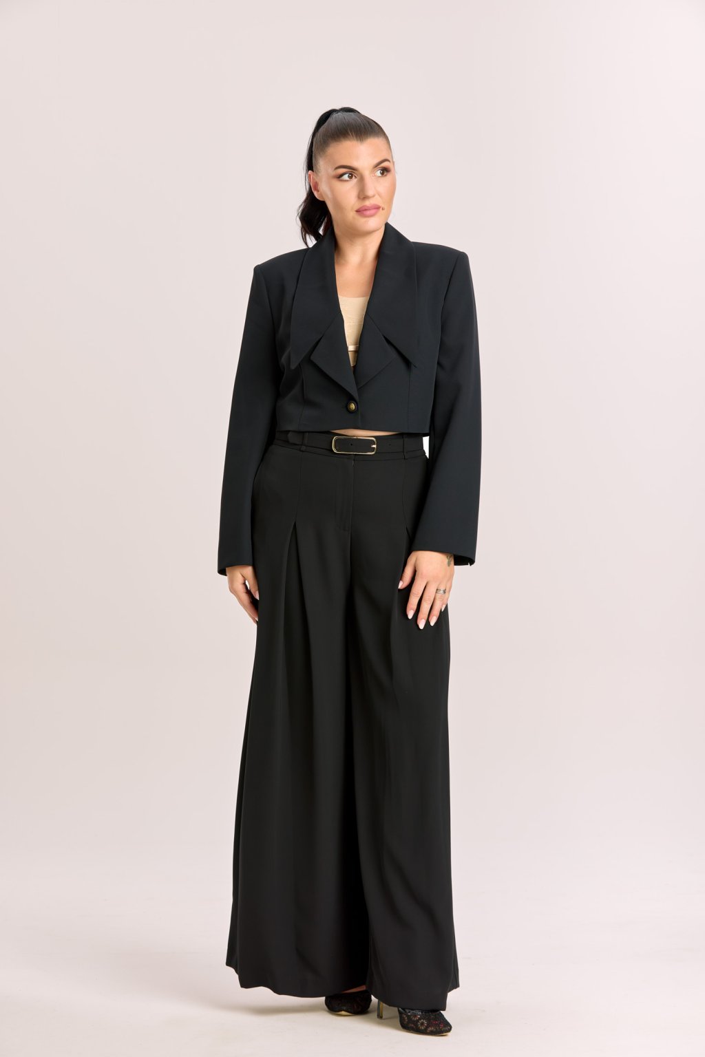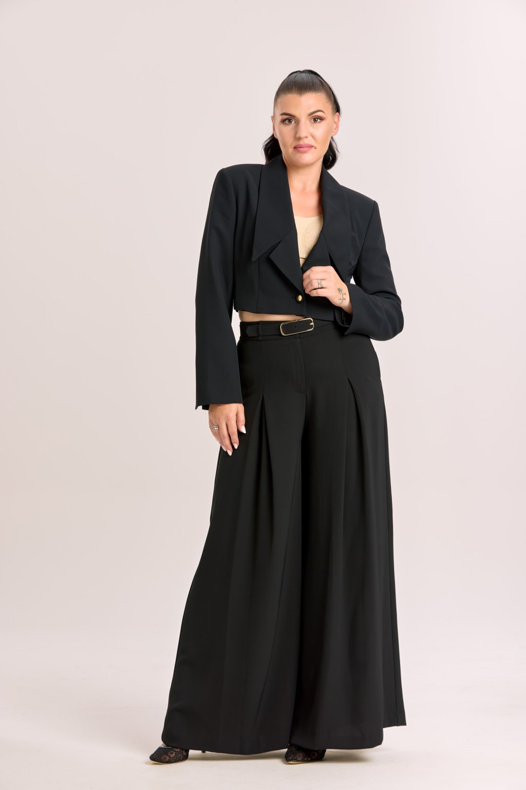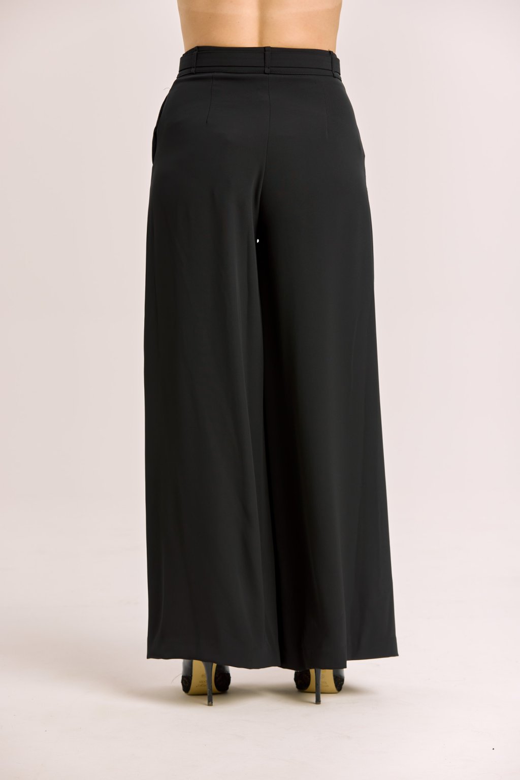 Dámské černé kalhoty Imperial v širokém elegantním střihu jsou navržené tak, aby podtrhly ženskou siluetu a zároveň poskytly maximální komfort. Vysoký pas opticky prodlužuje nohy a díky odšitým skladům v oblasti břicha nepřidává na objemu, takže působí velmi lichotivě. Splývavý materiál dodává kalhotám vzdušnost a lehkost, takže se hodí jak na každodenní nošení, tak i na společenské příležitosti. Stylový pásek s kovovou sponou je součástí modelu a dodává celku elegantní akcent. Kalhoty dokonale ladí s krátkým sakem Imperial do pasu, se kterým tvoří moderní a sofistikovaný komplet.