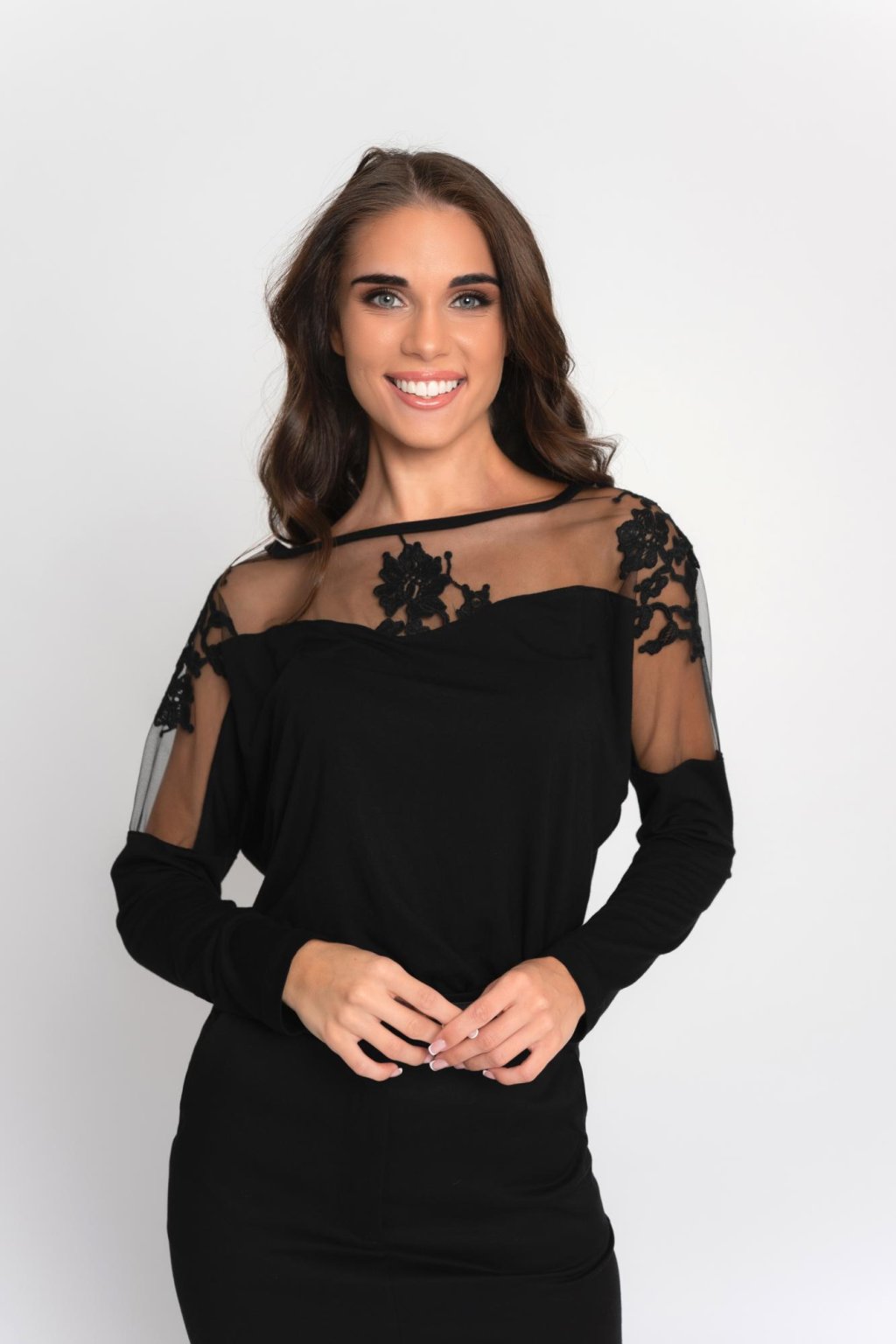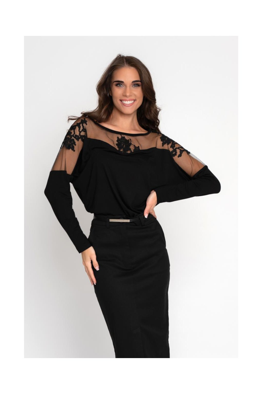 Tento luxusní dámský top Magenta je dokonalým kouskem pro ženy, které chtějí působit elegantně a zároveň moderně. Kombinace jemného tylu, květinové aplikace a hladkého úpletu vytváří efektní společenský model, který krásně zvýrazní dekolt i ramena. Tričko je ideální na večírky, oslavy, firemní akce i slavnostní příležitosti. Díky pohodlnému střihu a kvalitnímu materiálu se příjemně nosí a snadno kombinuje s úzkou sukní či elegantními kalhotami.