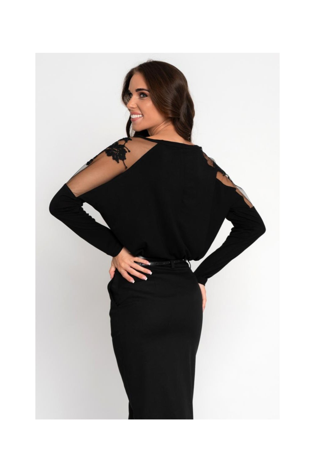 efekt odhalených ramen v kombinaci s dlouhým rukávem