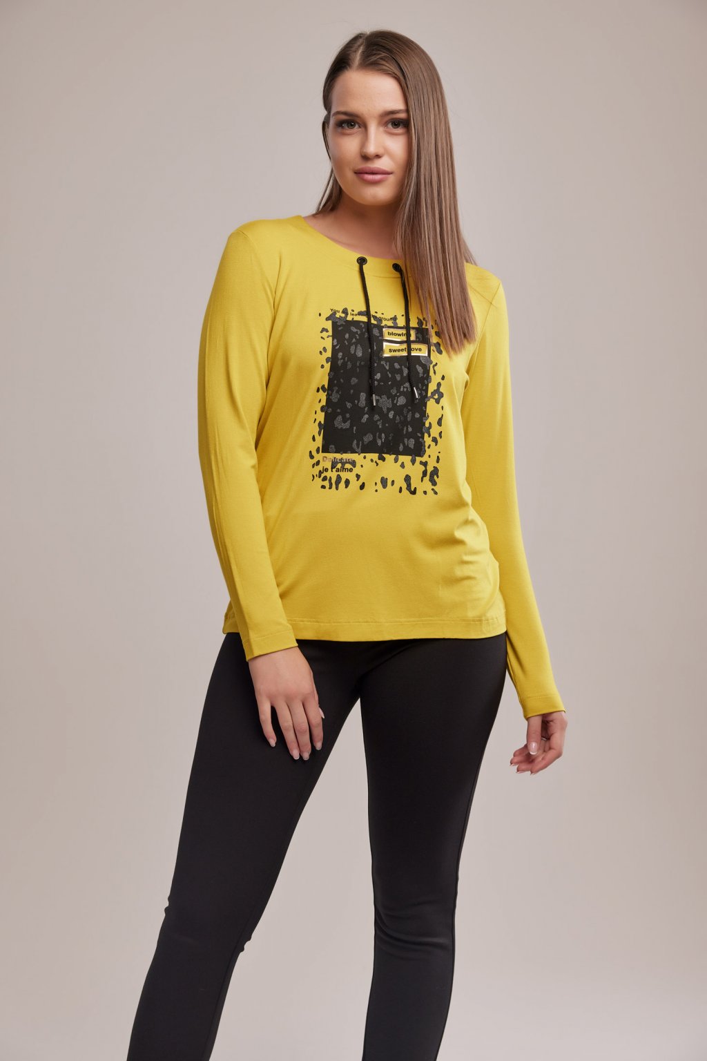 Dámské tričko s dlouhými rukávy má kulatý výstřih, který je ozdobený légou. Ve středu přední části je léga ozdobena kroužky, do kterých je provlečena tkanička. Na předním díle je lesklá černá aplikace s černými nápisy ve zlatém rámování. Tričko je vyrobeno z elastického viskózového úpletu v silnější gramáži. Doporučujeme prát na 30st. Dovoz Německo.