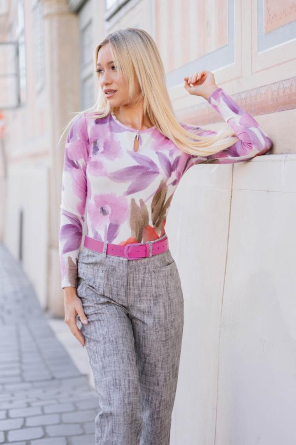 Dámské tričko značky Magenta je hravý a ženský kousek, který zaujme na první pohled díky výraznému květinovému potisku v odstínech růžové, fialové a červené. Jemný úplet se příjemně nosí a krásně se přizpůsobí postavě. Výstřih je oživen decentním zdobením ve tvaru kapky se štrasem, které působí elegantně a dodává tričku originální detail.