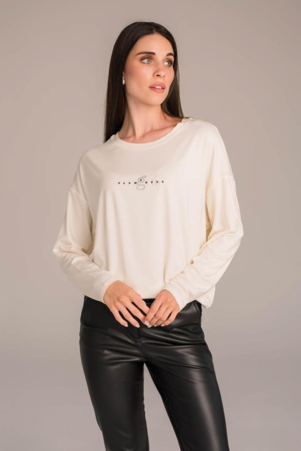 Dámské tričko Magenta s dlouhým rukávem představuje ideální spojení pohodlí a elegance. Vyrobené z příjemného elastického úpletu se snadno přizpůsobí postavě a působí velmi žensky. Minimalistický potisk s nápisem „Glamorous“ doplněný o drobné kamínky dodává tričku decentní, ale luxusní vzhled. Díky volnějšímu střihu a jemnému lesku materiálu působí ležérně i sofistikovaně – perfektní volba k džínám, koženým kalhotám i elegantním sukním.