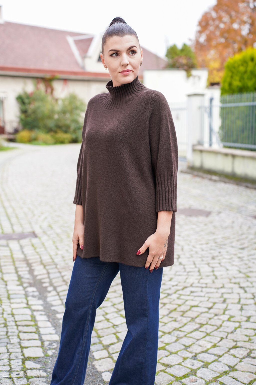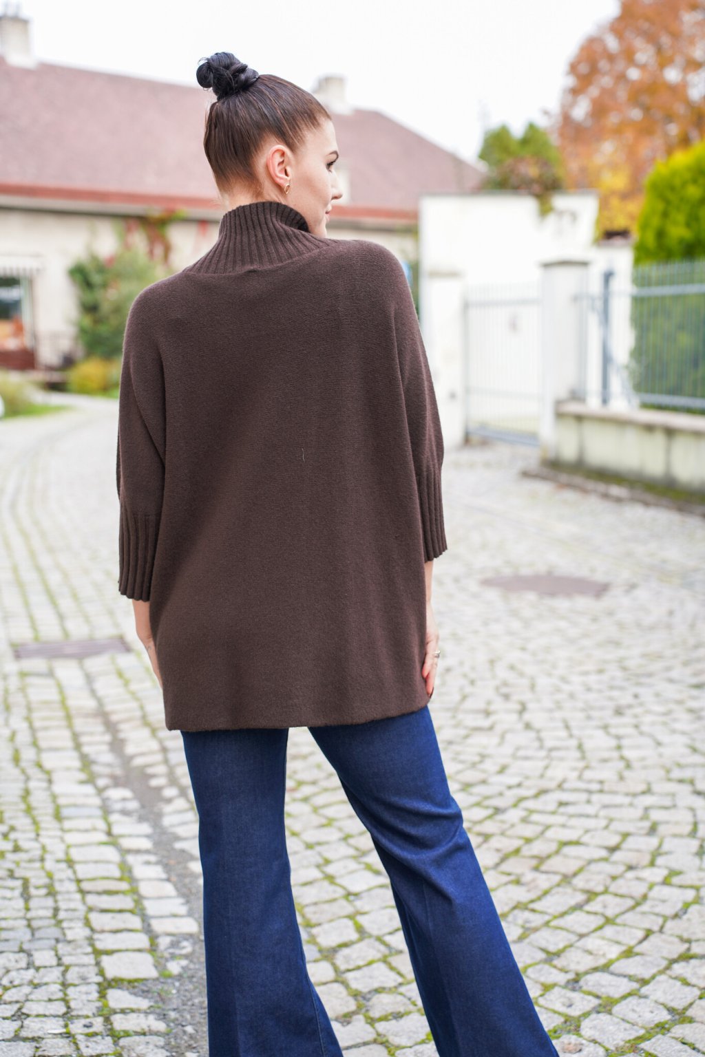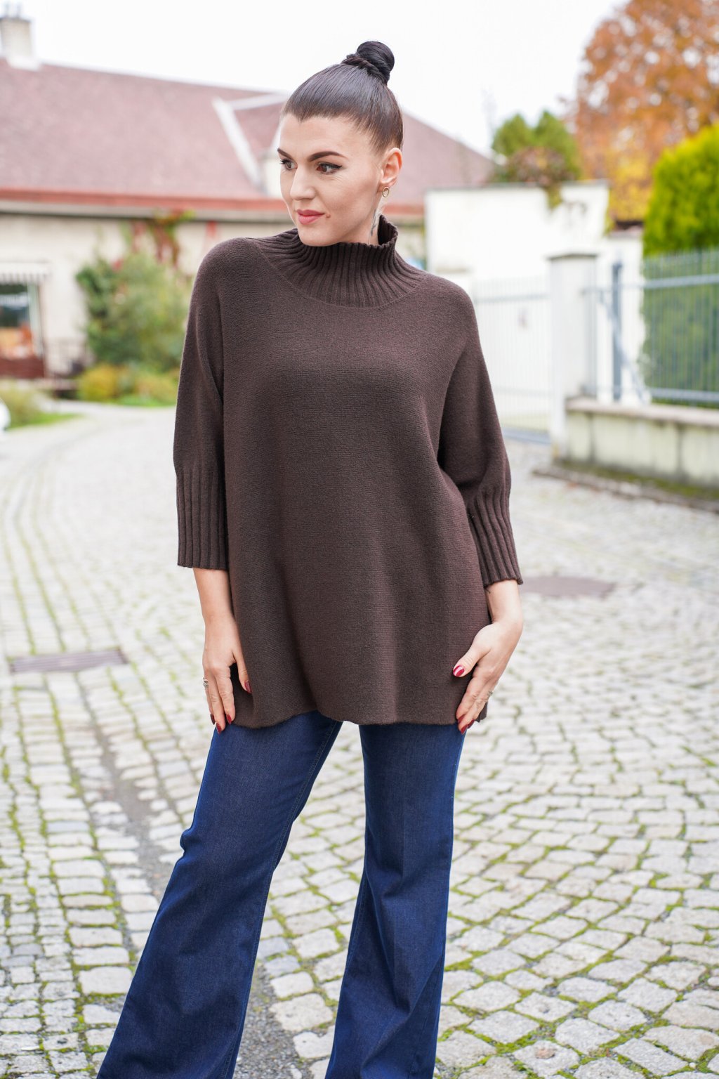 Dámský dlouhý svetr se stojáčkem značky Imperial ve velice módním čokoládově hnědém odstínu působí sofistikovaně a zároveň velmi pohodlně. Vyroben z kvalitního úpletu s vysokým podílem viskózy, která zajišťuje měkkost, hřejivost a příjemný omak bez nepříjemného kousání. Volnější střih se spadlými rameny a žebrovanými detaily na rukávech dodává svetru moderní vzhled a komfort při nošení. Skvěle se kombinuje s džínami, úzkými kalhotami i legínami – ideální volba pro chladnější dny.