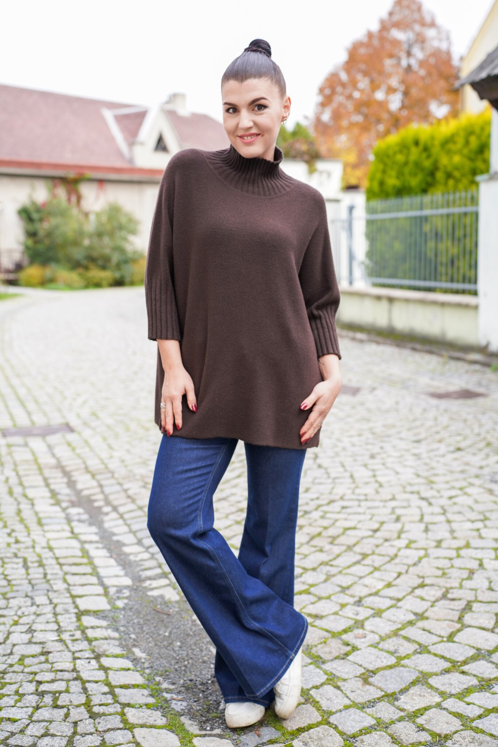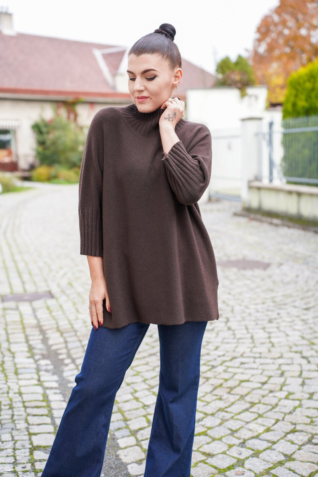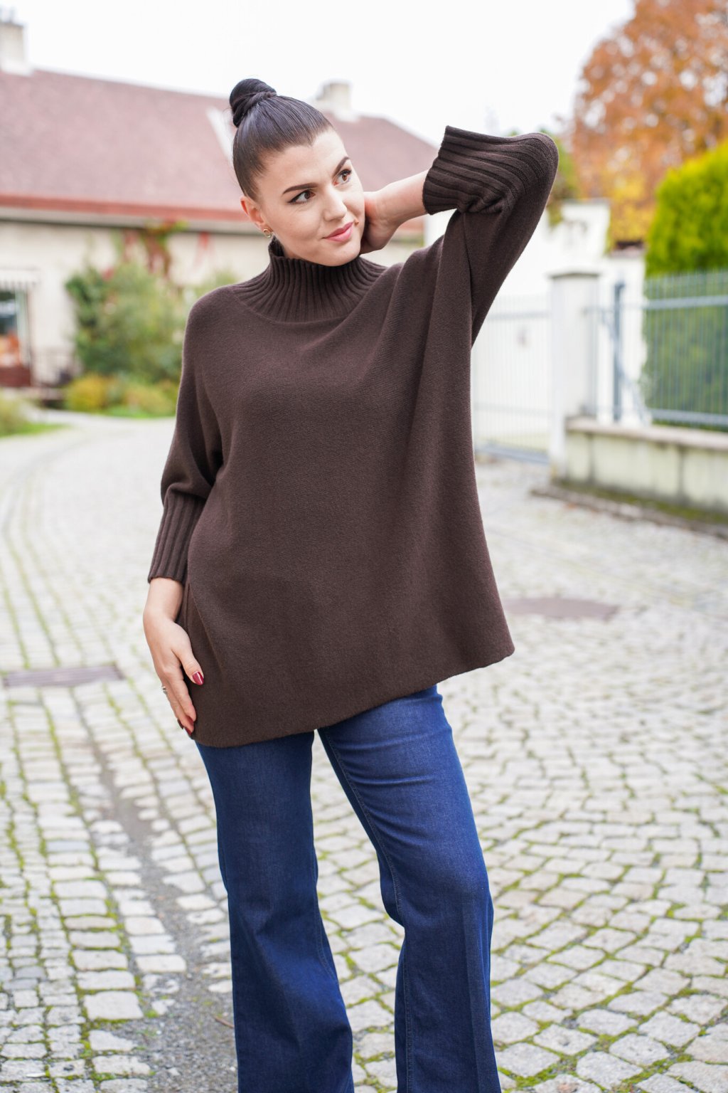 Dámský dlouhý svetr se stojáčkem značky Imperial ve velice módním čokoládově hnědém odstínu působí sofistikovaně a zároveň velmi pohodlně. Vyroben z kvalitního úpletu s vysokým podílem viskózy, která zajišťuje měkkost, hřejivost a příjemný omak bez nepříjemného kousání. Volnější střih se spadlými rameny a žebrovanými detaily na rukávech dodává svetru moderní vzhled a komfort při nošení. Skvěle se kombinuje s džínami, úzkými kalhotami i legínami – ideální volba pro chladnější dny.