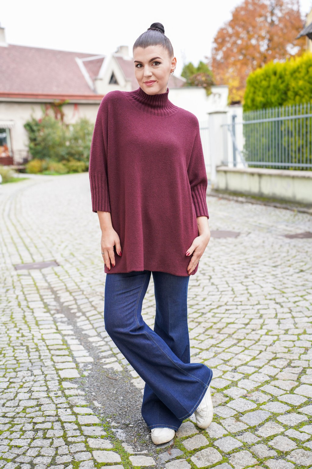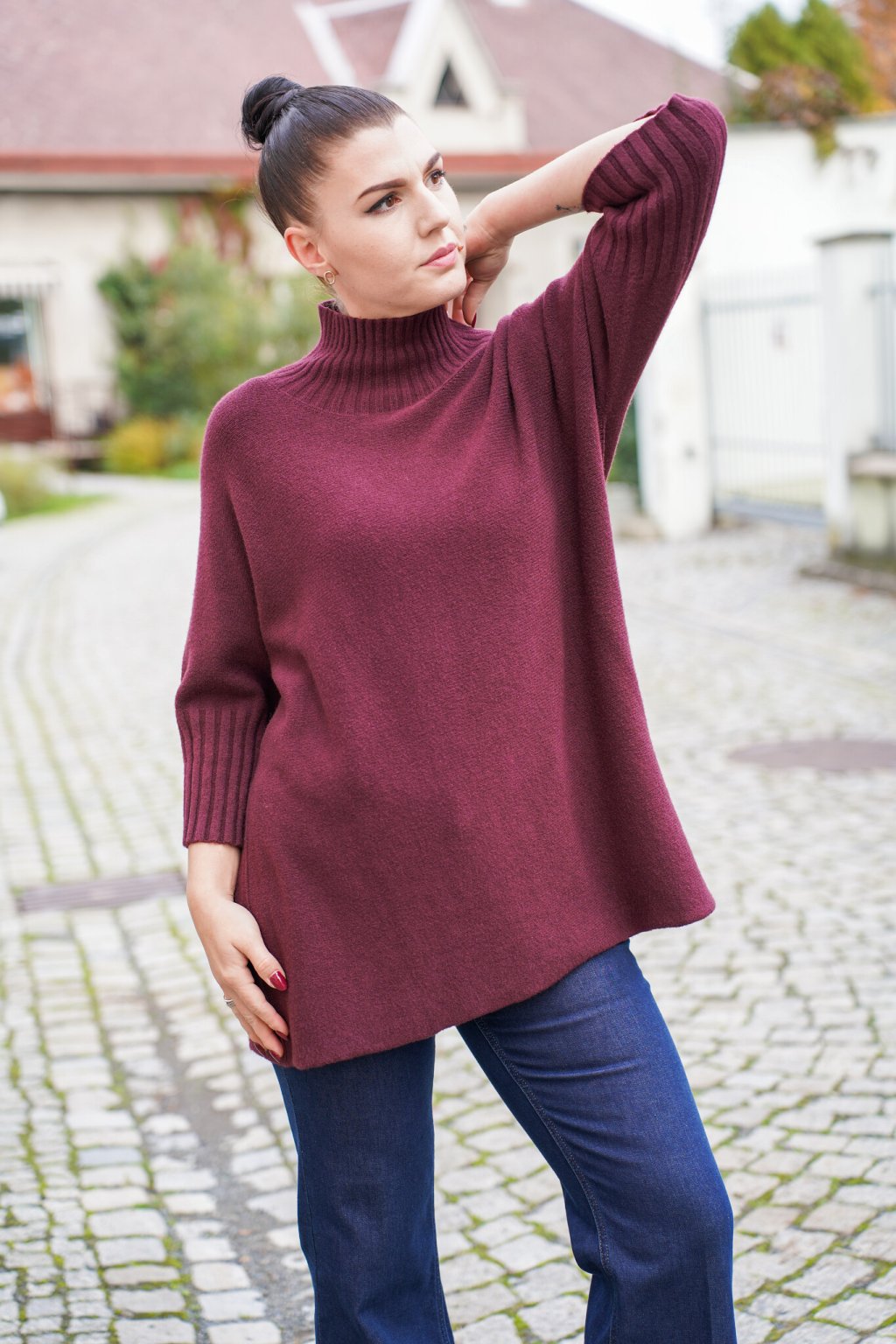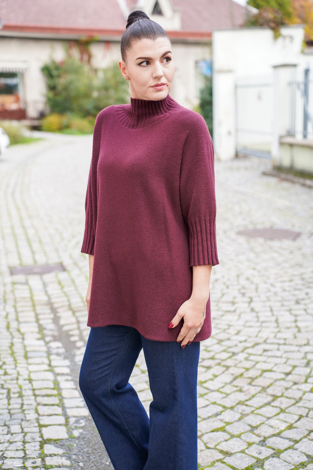 Dámský dlouhý svetr se stojáčkem značky Imperial v elegantním vínovém odstínu působí sofistikovaně a zároveň velmi pohodlně. Vyroben z kvalitního úpletu s vysokým podílem viskózy, která zajišťuje měkkost, hřejivost a příjemný omak bez nepříjemného kousání. Volnější střih se spadlými rameny a žebrovanými detaily na rukávech dodává svetru moderní vzhled a komfort při nošení. Skvěle se kombinuje s džínami, úzkými kalhotami i legínami – ideální volba pro chladnější dny.