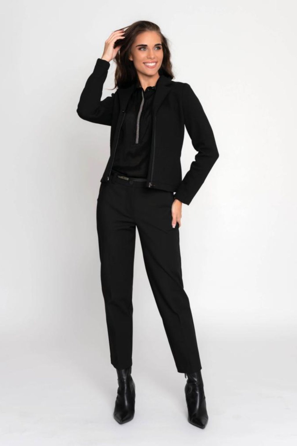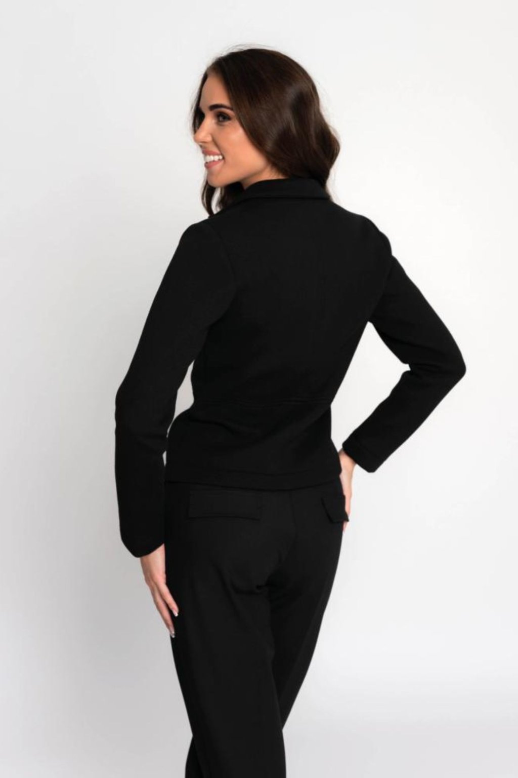 Tento krátký kabátek v čistě černé barvě krásně formuje postavu, snadno se kombinuje a dodá vašemu outfitu luxusní minimalistický vzhled. Díky kvalitnímu, hřejivému materiálu je ideální na podzim i zimu, kdy oceníte jeho pohodlí i praktický střih. Perfektně ladí jak s elegantními kalhotami, tak se sukní či šaty – skvělý společník do práce, na schůzky i večerní příležitosti.