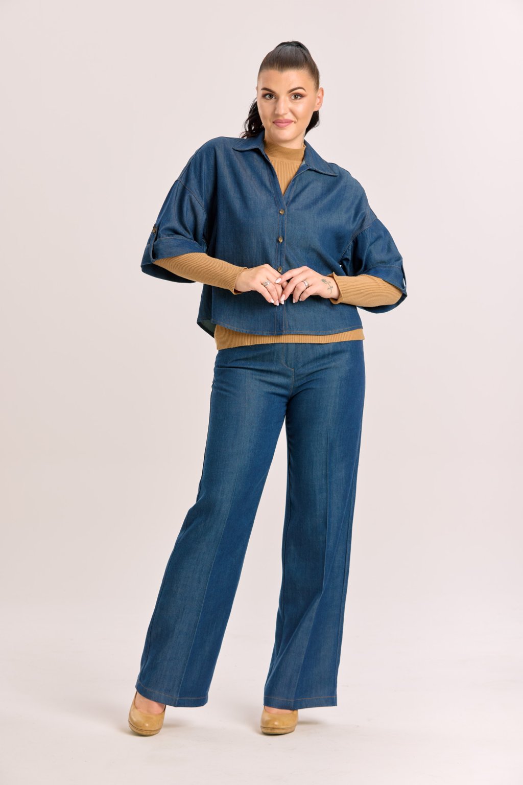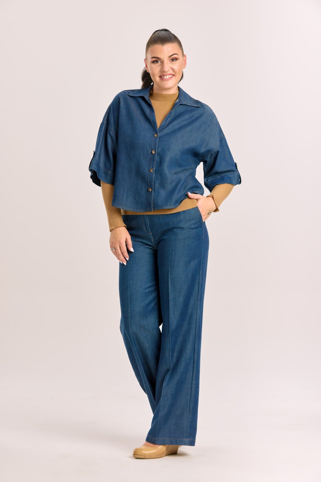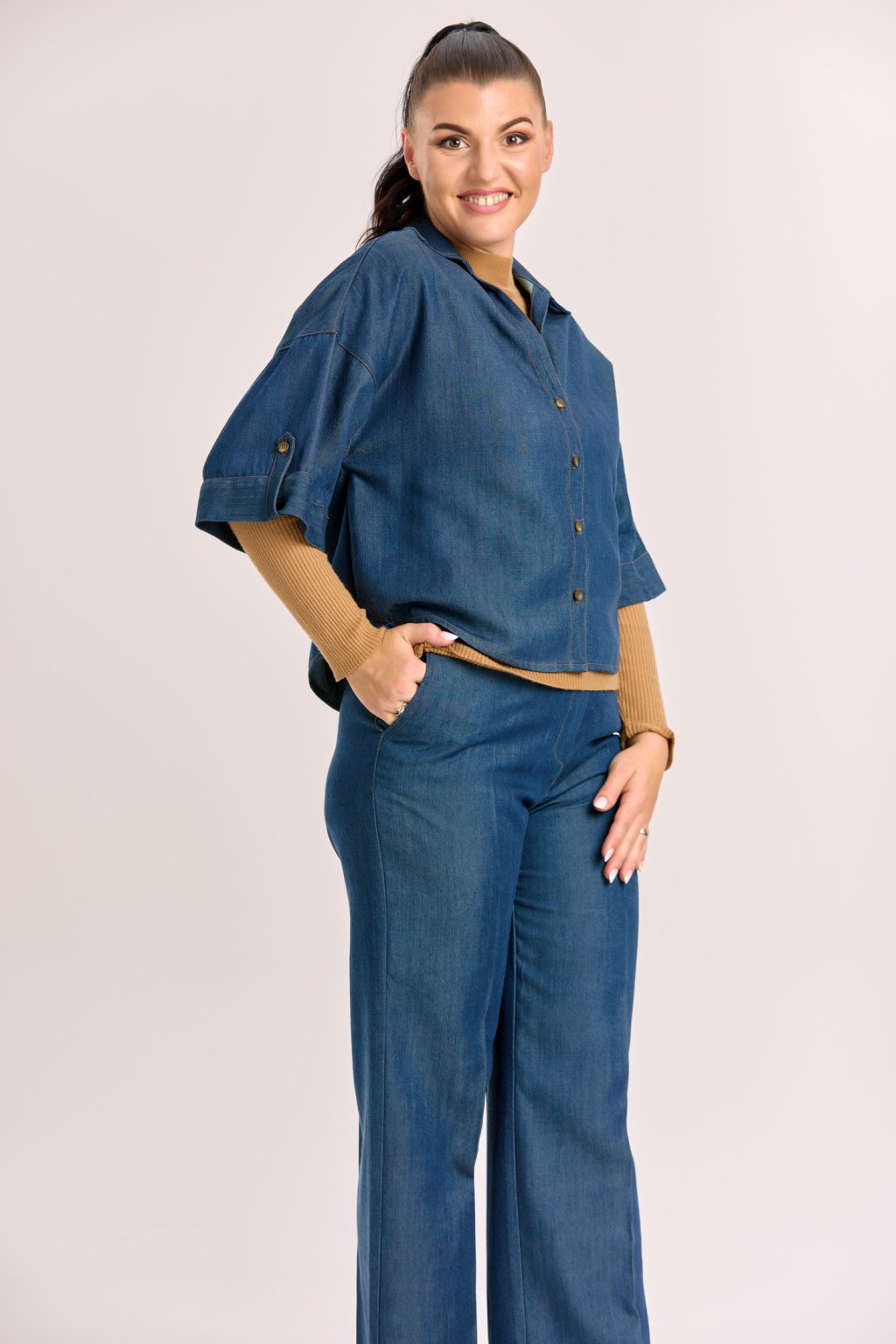 Dámský kabátek Imperial z jemného lyocellu je skvělou volbou pro ženy, které hledají styl i pohodlí v jednom. Lehký materiál je příjemný na nošení a díky modernímu kratšímu střihu s límečkem a knoflíkovým zapínáním působí elegantně a uvolněně zároveň. Spadlé rukávy s možností ohrnutí dodávají ležérní nádech a univerzální modrá barva ve stylu denimu se snadno kombinuje. Kabátek můžete nosit samostatně, nebo si ho pořídit společně s kalhotami ve stejném designu a vytvořit tak dokonale sladěný komplet.