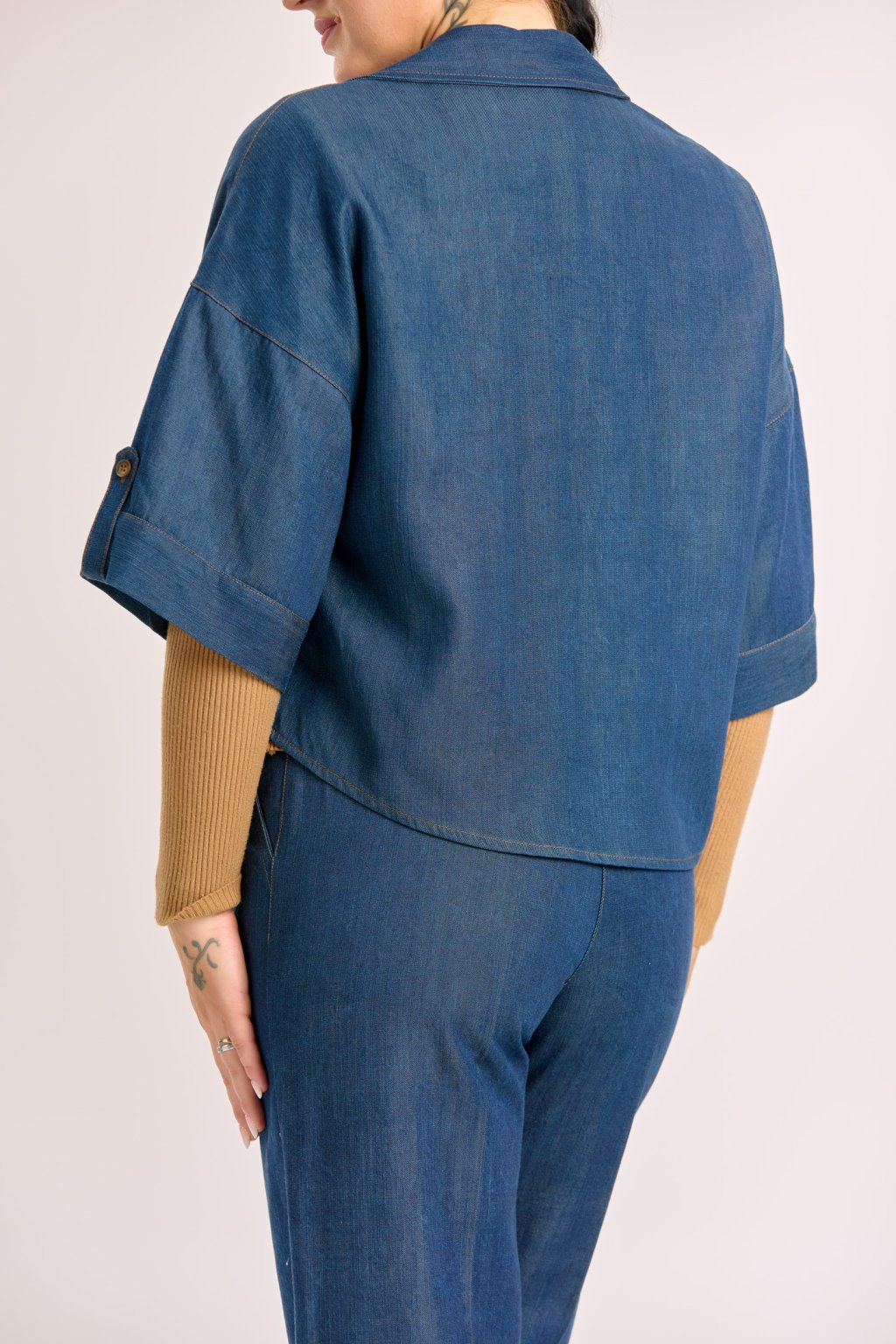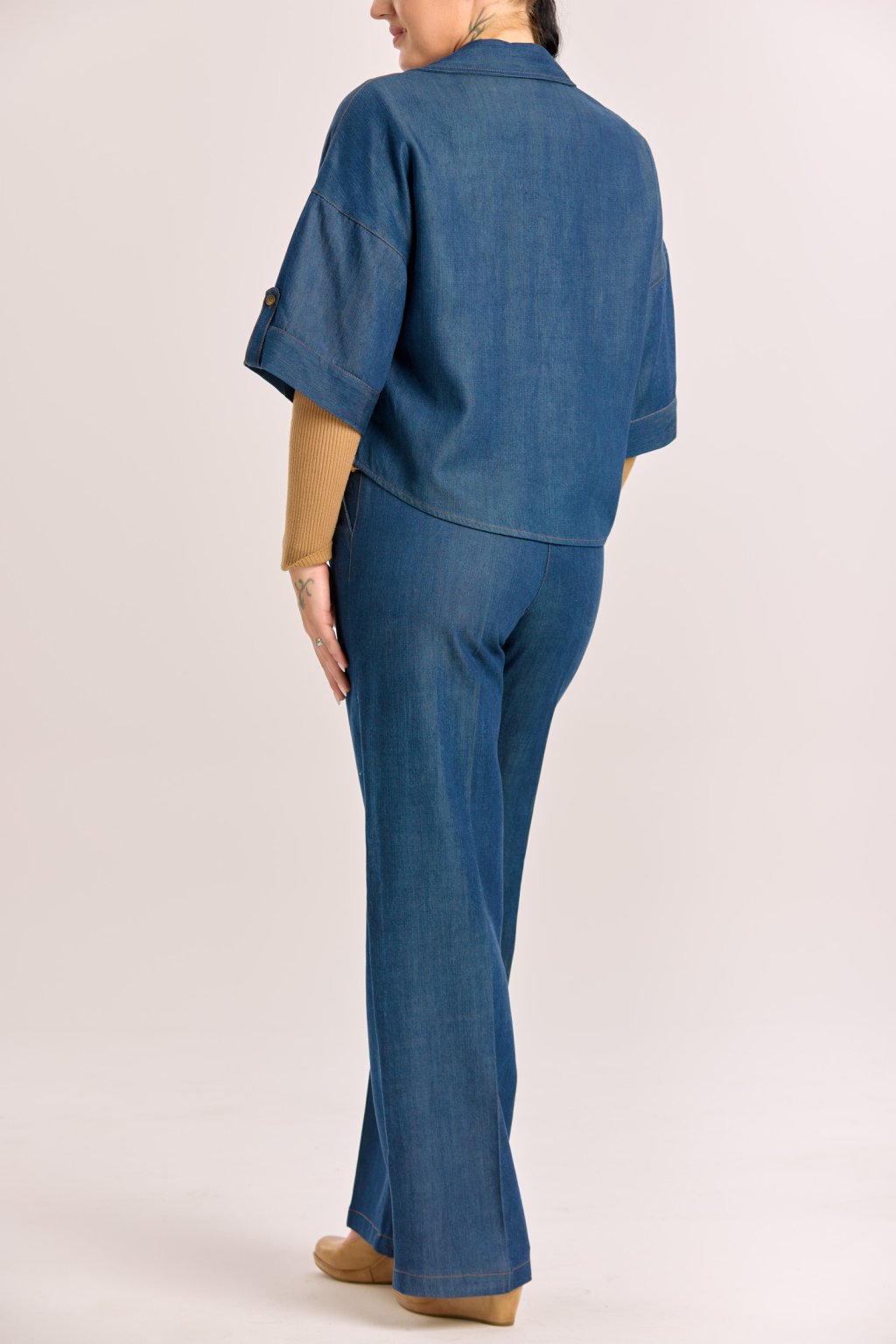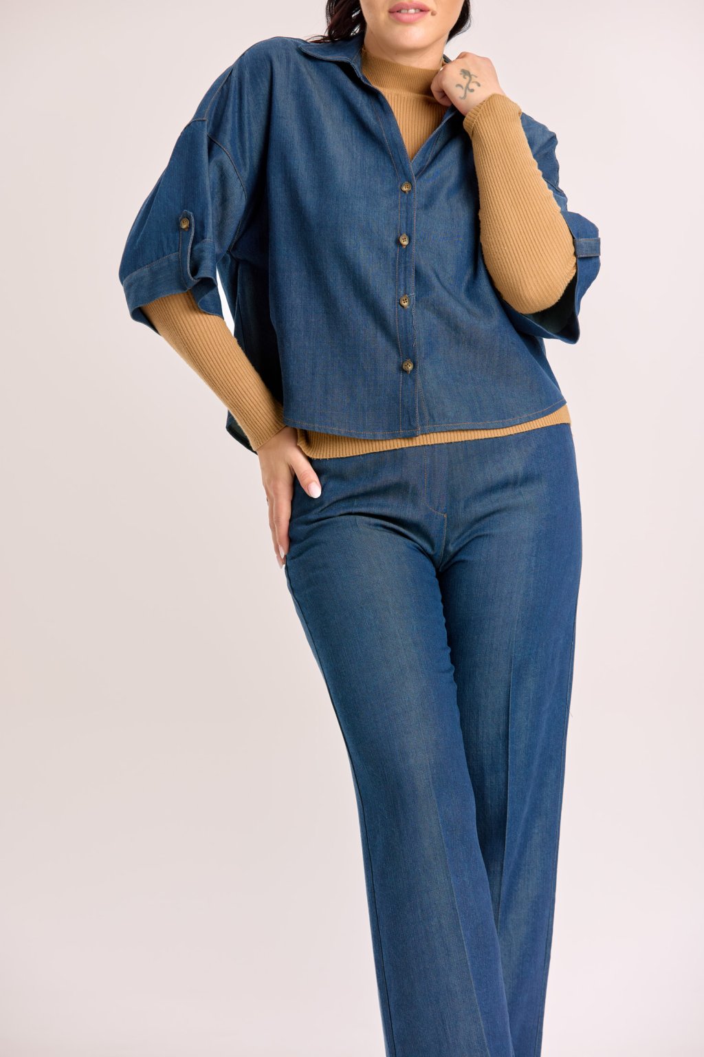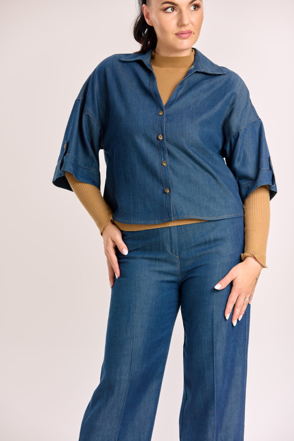 Dámský kabátek Imperial z jemného lyocellu je skvělou volbou pro ženy, které hledají styl i pohodlí v jednom. Lehký materiál je příjemný na nošení a díky modernímu kratšímu střihu s límečkem a knoflíkovým zapínáním působí elegantně a uvolněně zároveň. Spadlé rukávy s možností ohrnutí dodávají ležérní nádech a univerzální modrá barva ve stylu denimu se snadno kombinuje. Kabátek můžete nosit samostatně, nebo si ho pořídit společně s kalhotami ve stejném designu a vytvořit tak dokonale sladěný komplet.
