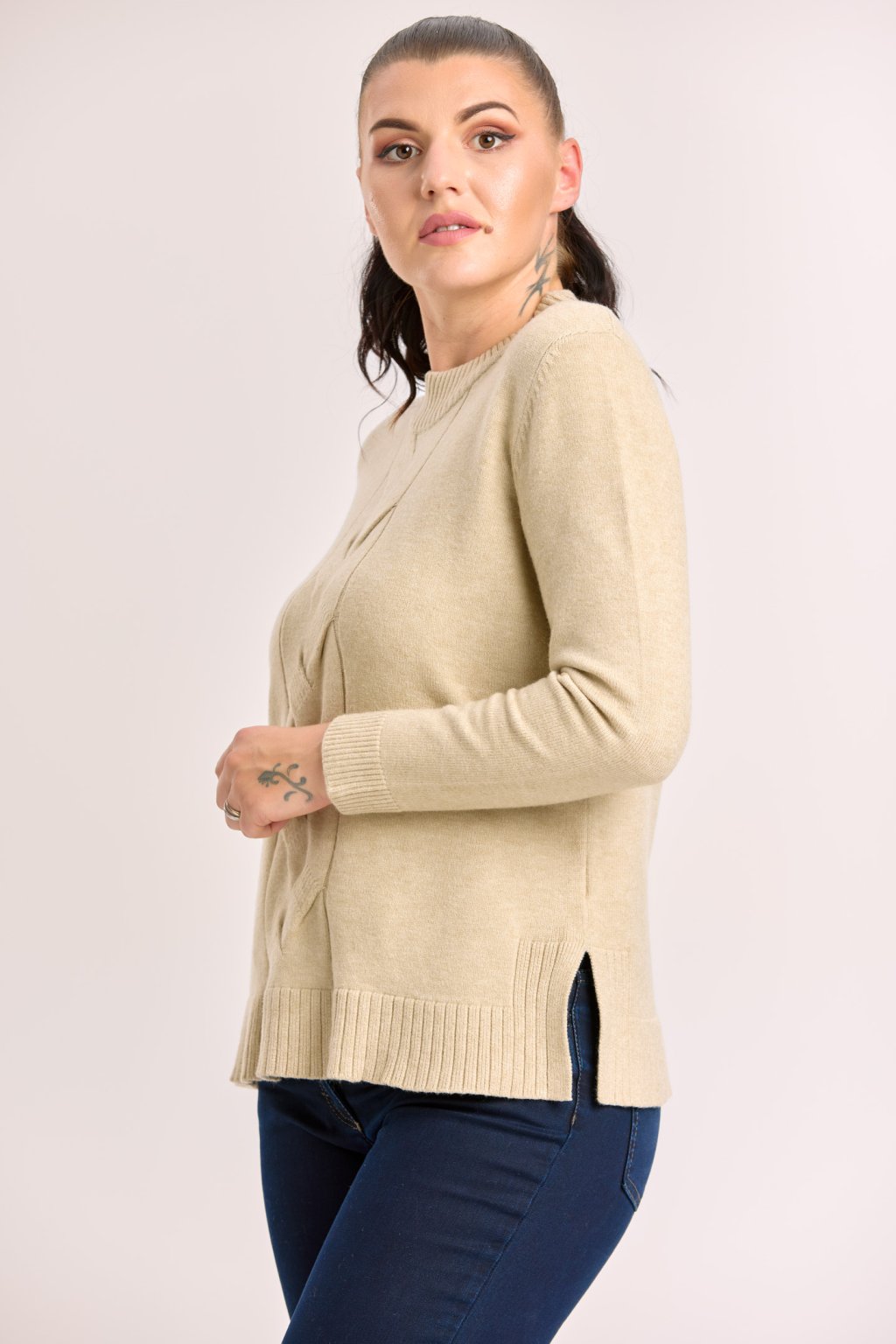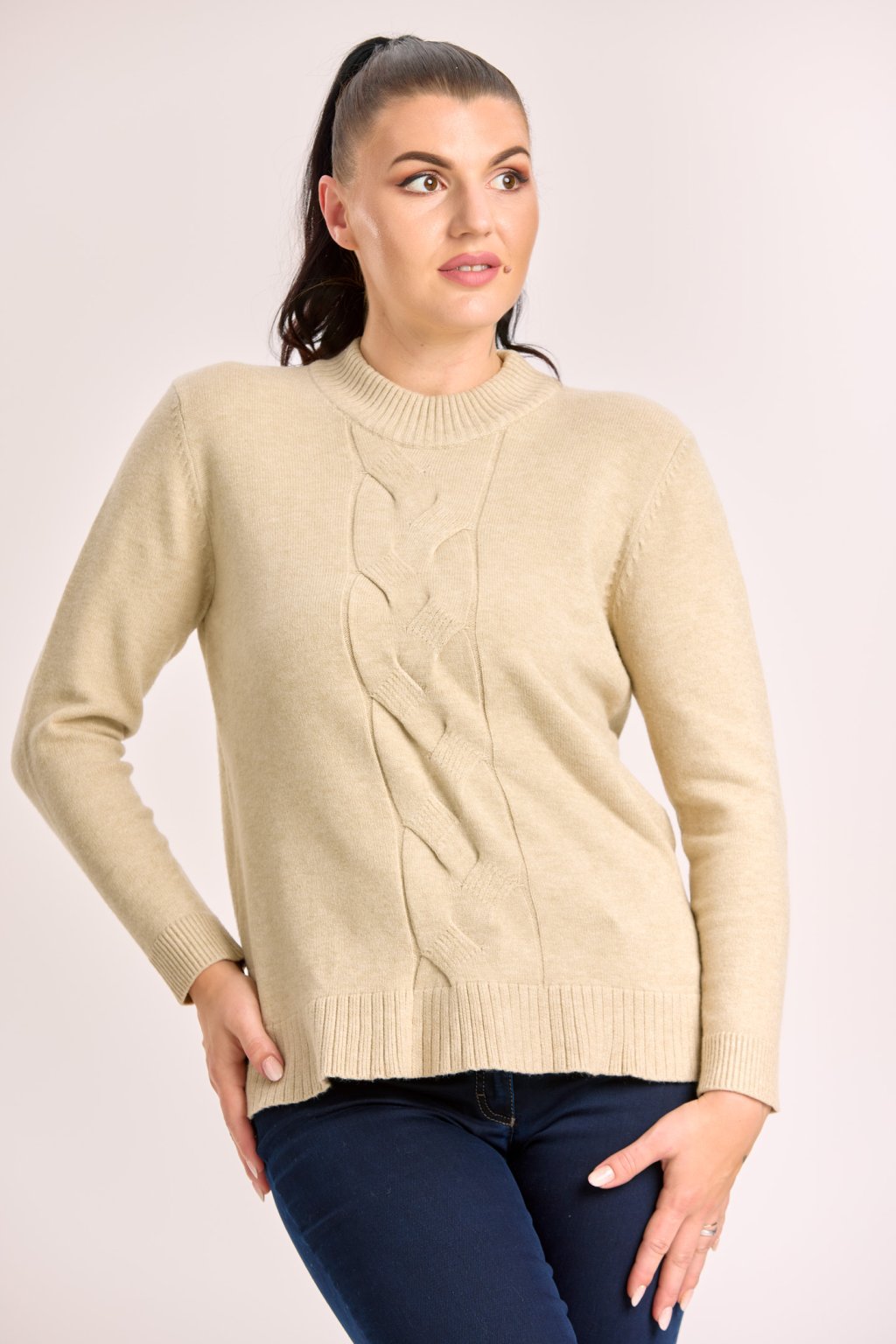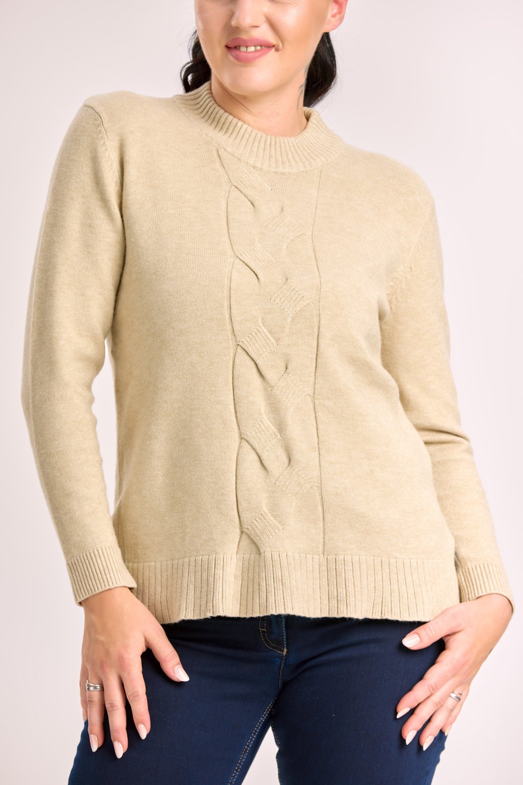 Tento dámský svetr značky Navigazione je elegantní volbou pro chladnější dny. Vyrobený z kvalitní směsi viskózy, polyesteru a polyamidu, působí na těle příjemně měkce, přitom si zachovává tvar a dlouhou životnost. Jemně béžový odstín se strukturálním copánkovým vzorem na předním díle dodává svetru jemný, ale moderní vzhled. Stojáček a žebrované lemy u krku, rukávů i spodního okraje zajišťují, že svetr dobře sedí a působí upraveně. Díky univerzálnímu stylu jej snadno zkombinujete s džínami i elegantními kalhotami.