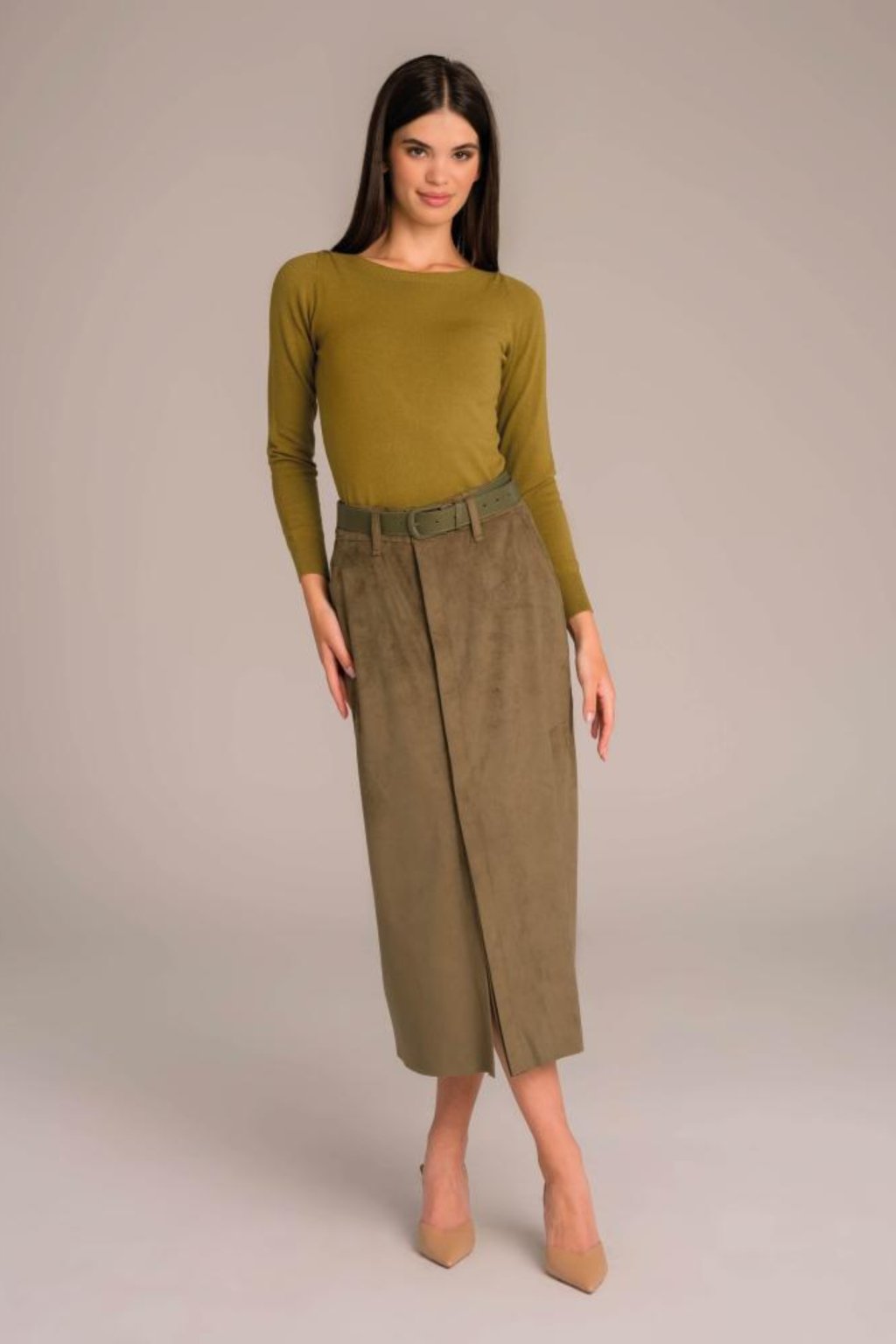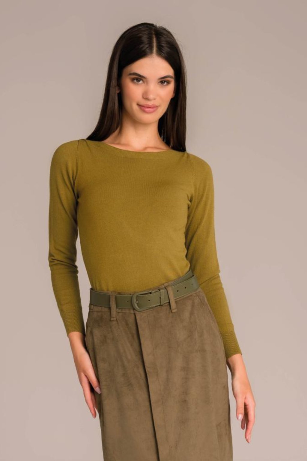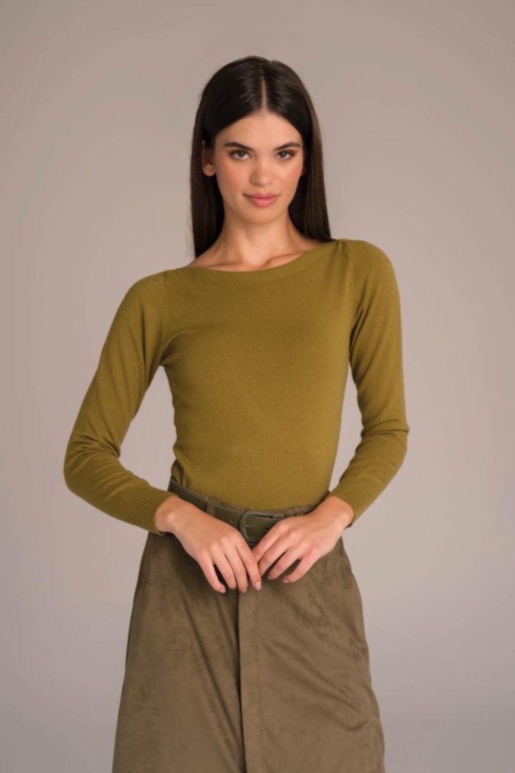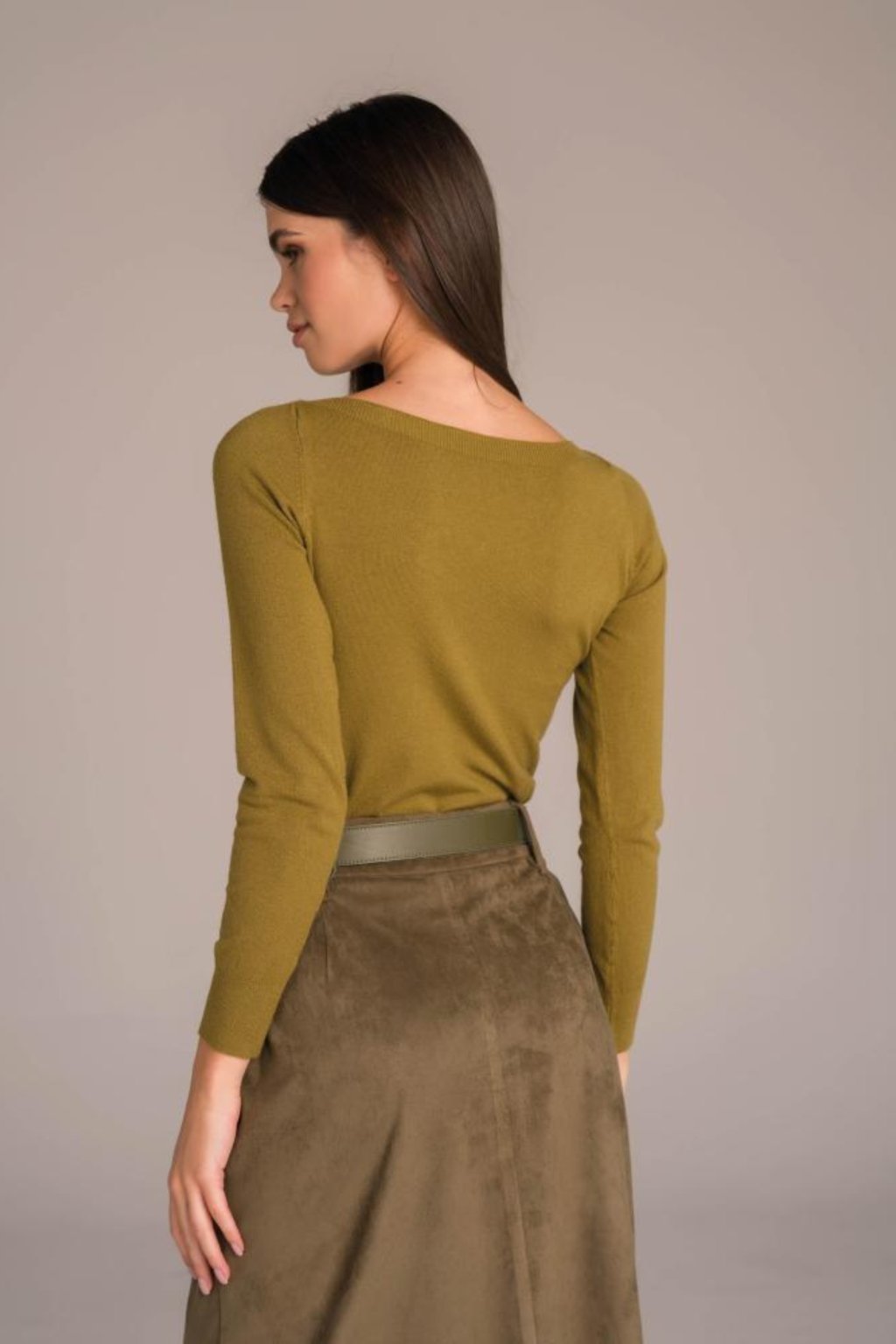 Dámský úpletový svetřík Magenta v olivově zeleném odstínu je ideálním základem pro elegantní i ležérní outfity. Jemný úplet krásně přilne k postavě a díky příměsi elastanu poskytuje maximální pohodlí po celý den. Decentní kulatý výstřih s mírně spadlými rameny působí ženským a sofistikovaným dojmem. Tento model snadno zkombinujete s kalhotami, sukní nebo sakem a vytvoříte tak nadčasový look vhodný do práce i na volný čas.